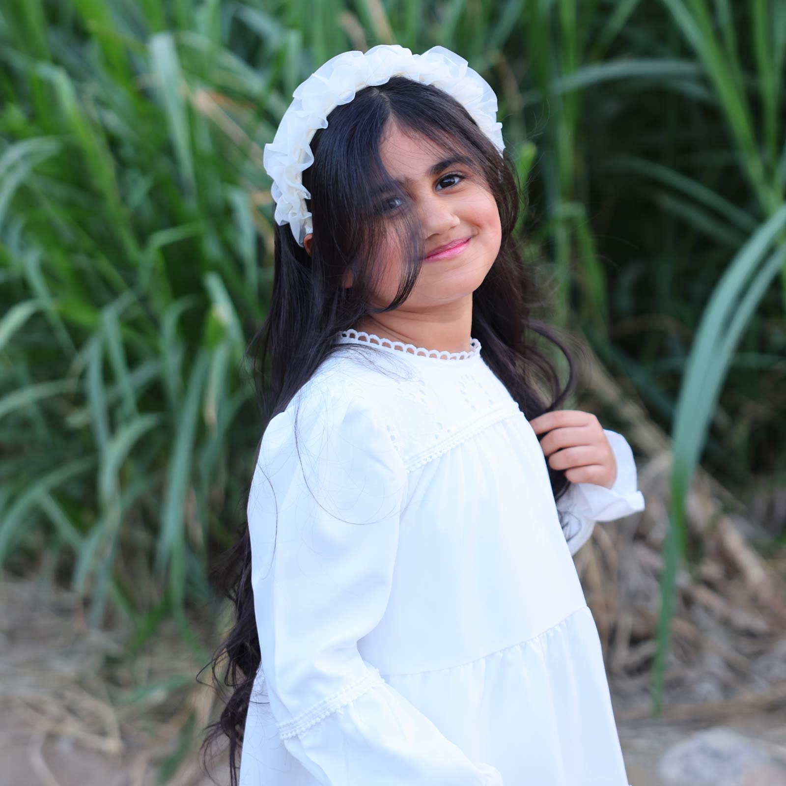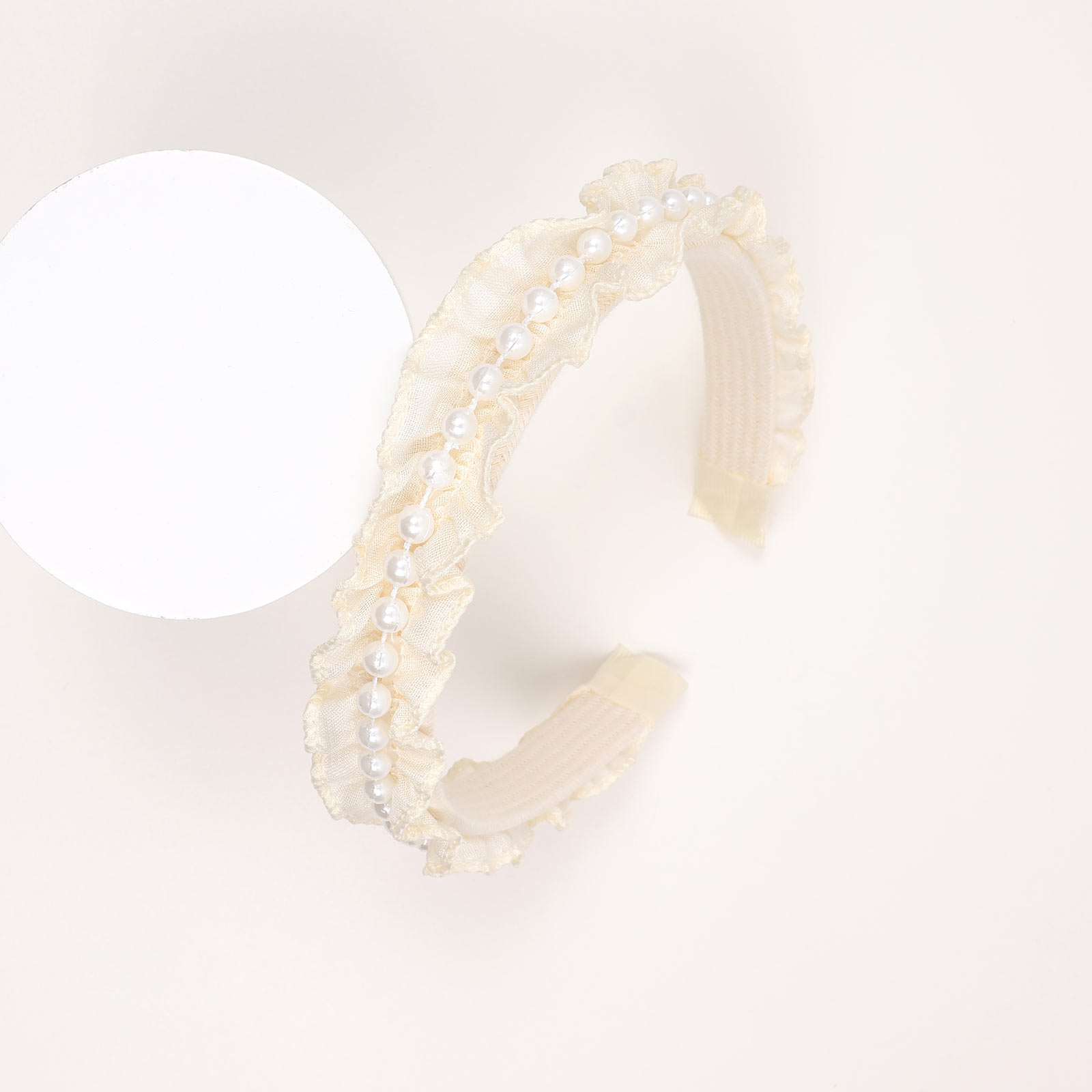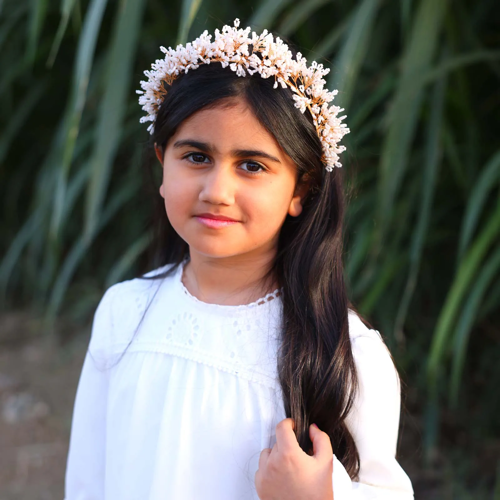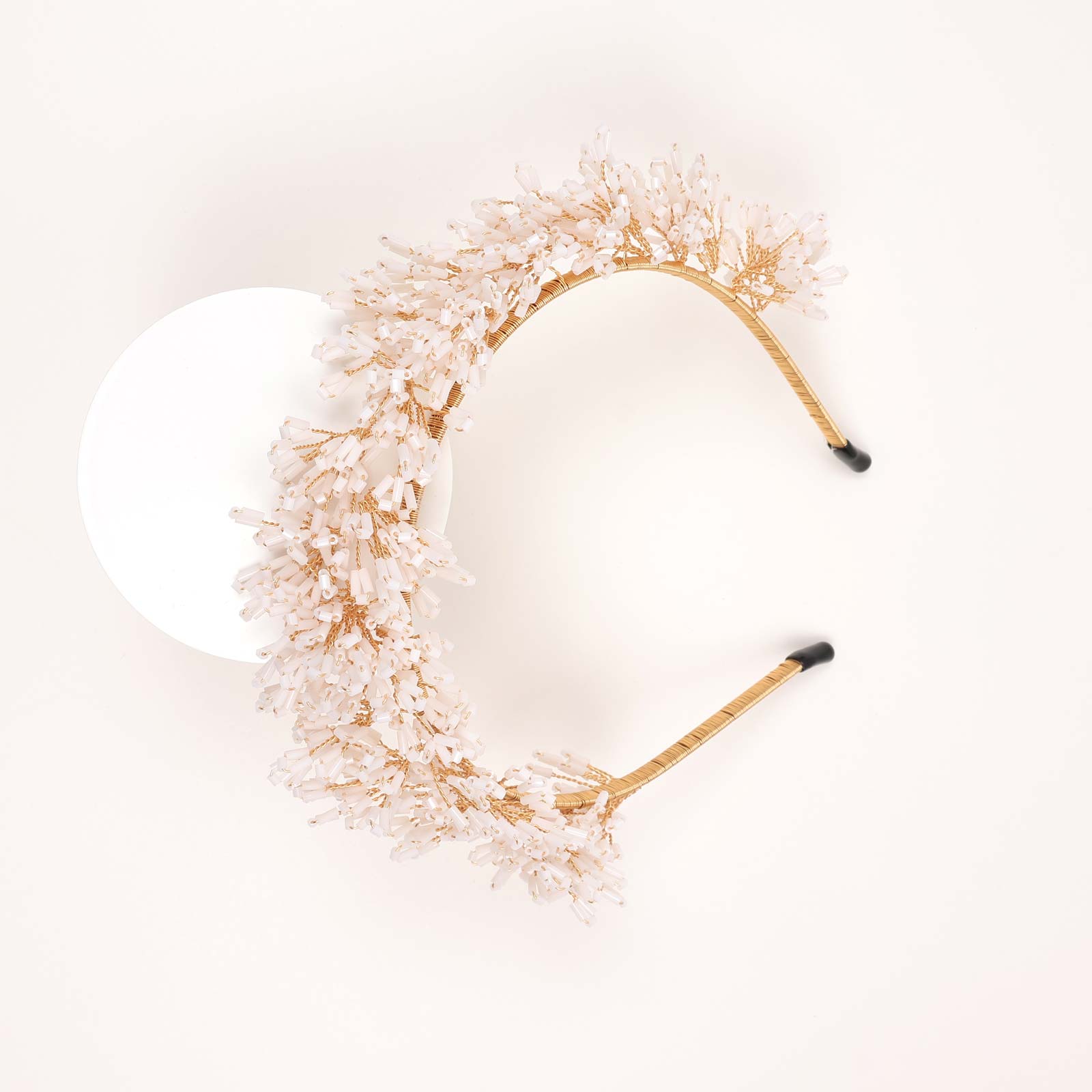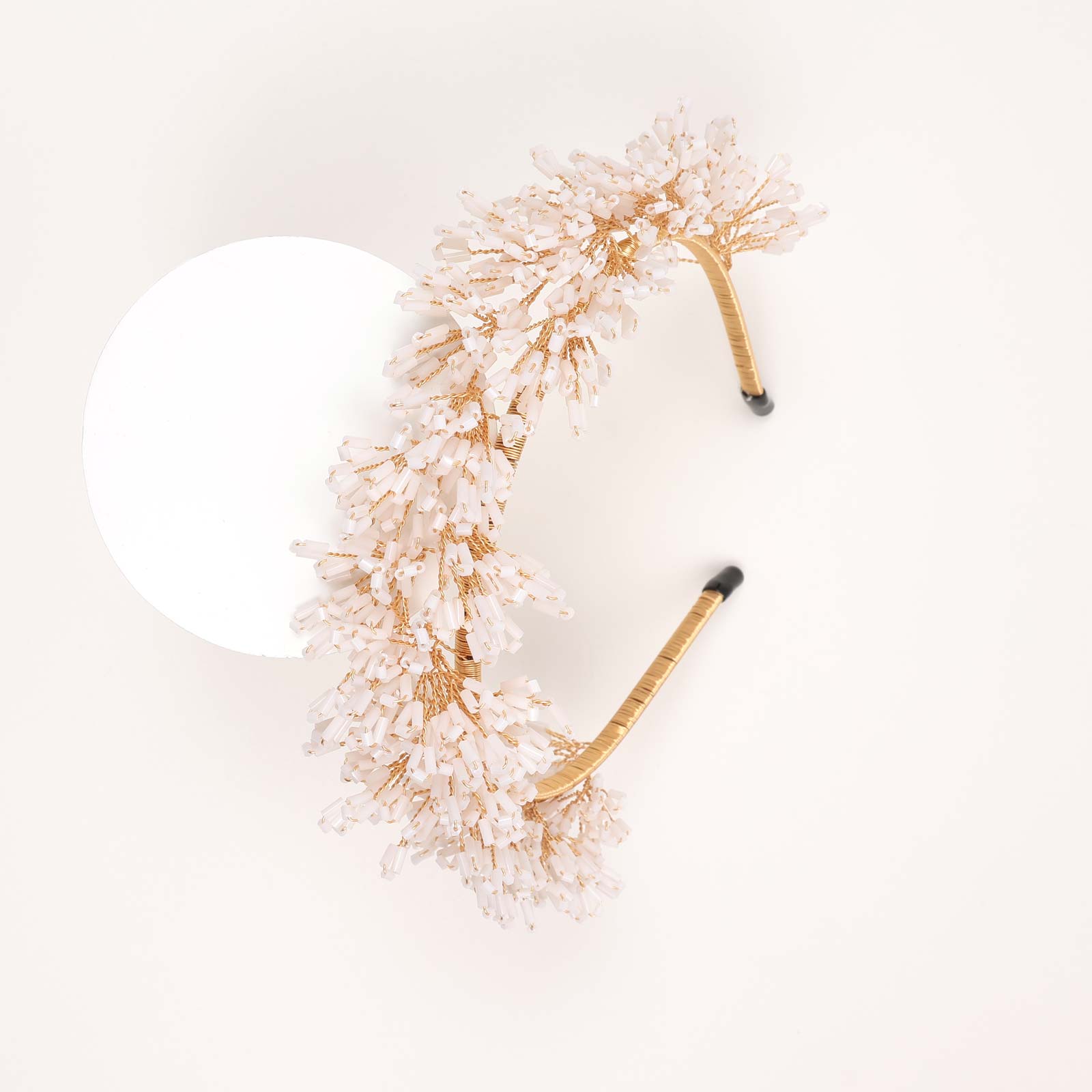 A structured hairband adorned with clustered beadwork arranged in a floral-inspired pattern. Designed with a slim wrapped band and dimensional detailing.