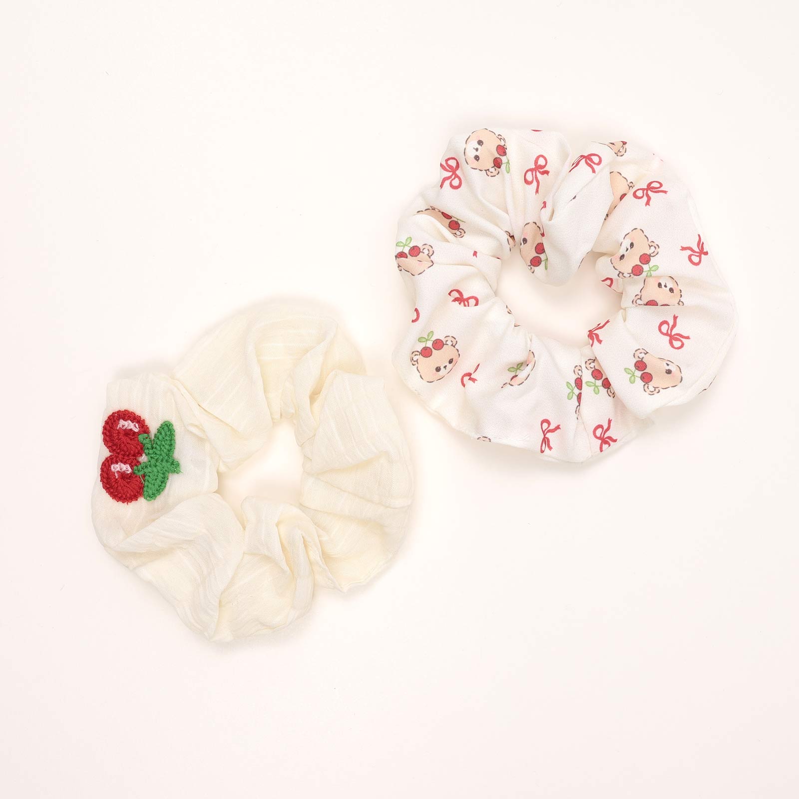Bear and Cherry Embroidered Hair Scrunchie Set