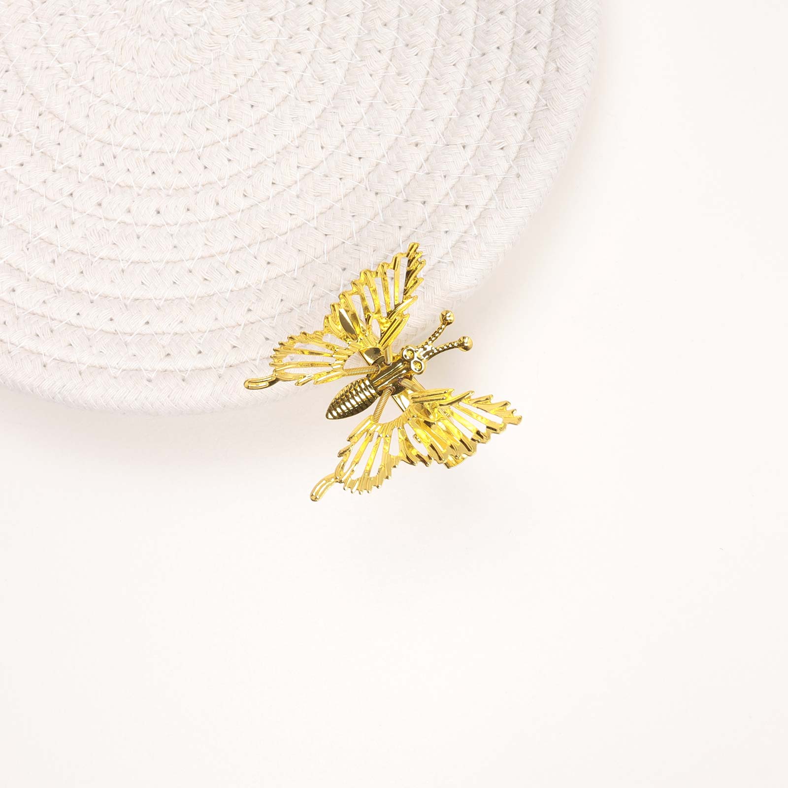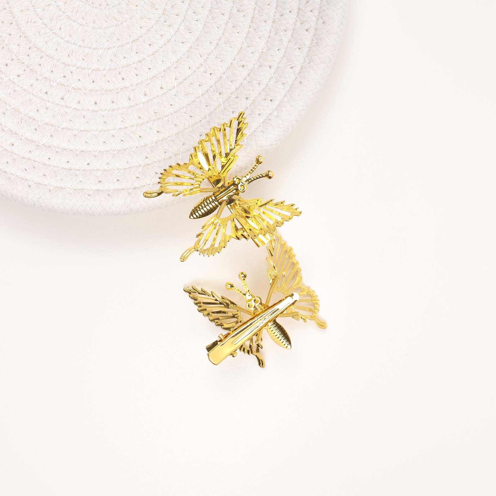 A metal hair clip featuring a butterfly shape.