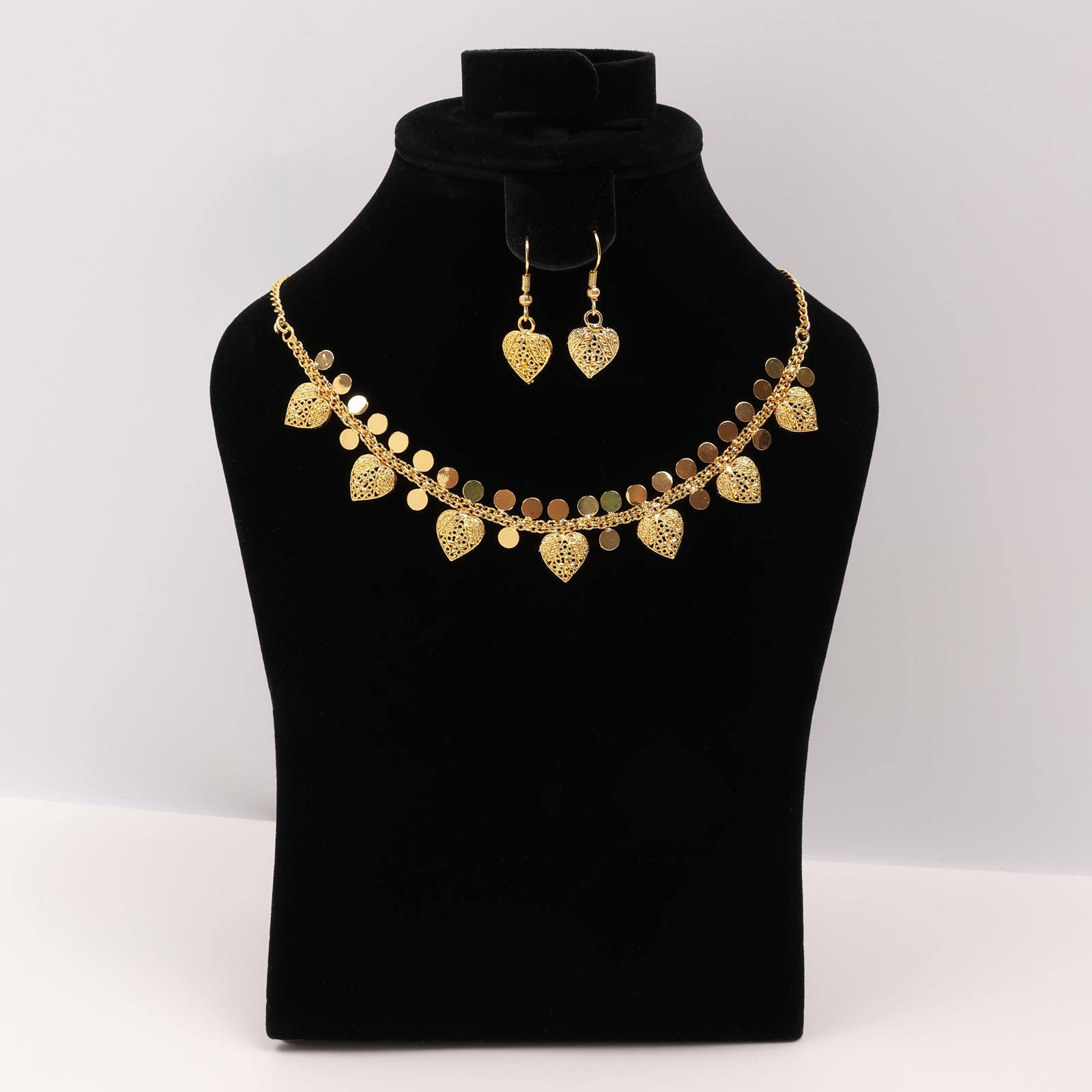 Statement jewelry set featuring textured coin pendants with crystal accents. Includes matching drop earrings and a layered chain necklace.