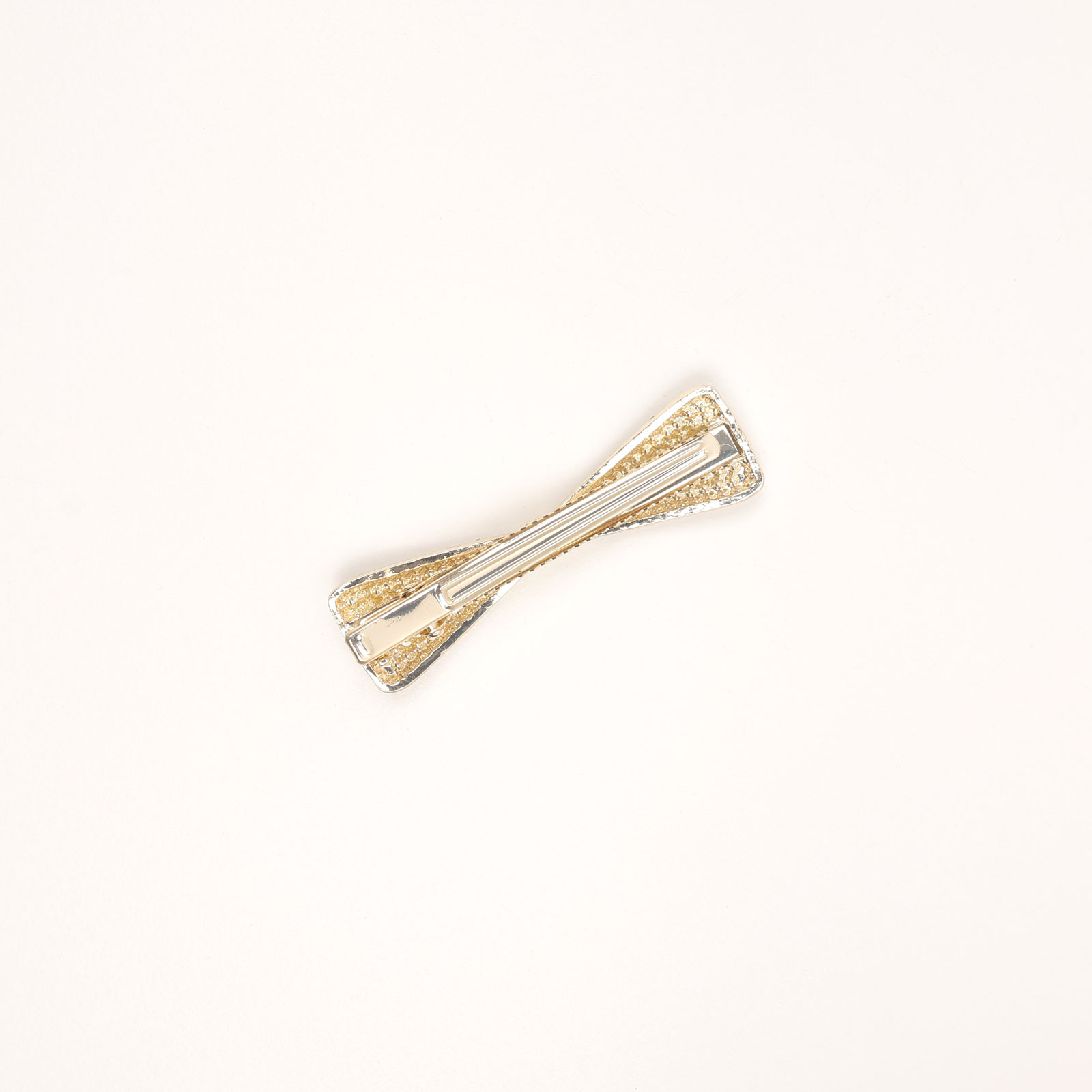 Metal hair clip shaped like a bow accessory, adorned with shimmering crystals.