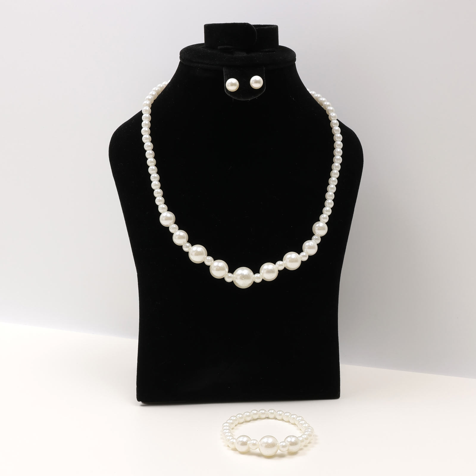 A classic jewelry set featuring a graduated pearl design. The necklace and matching stretch bracelet use lustrous faux pearls that increase in size toward the center. Paired with round stud earrings.