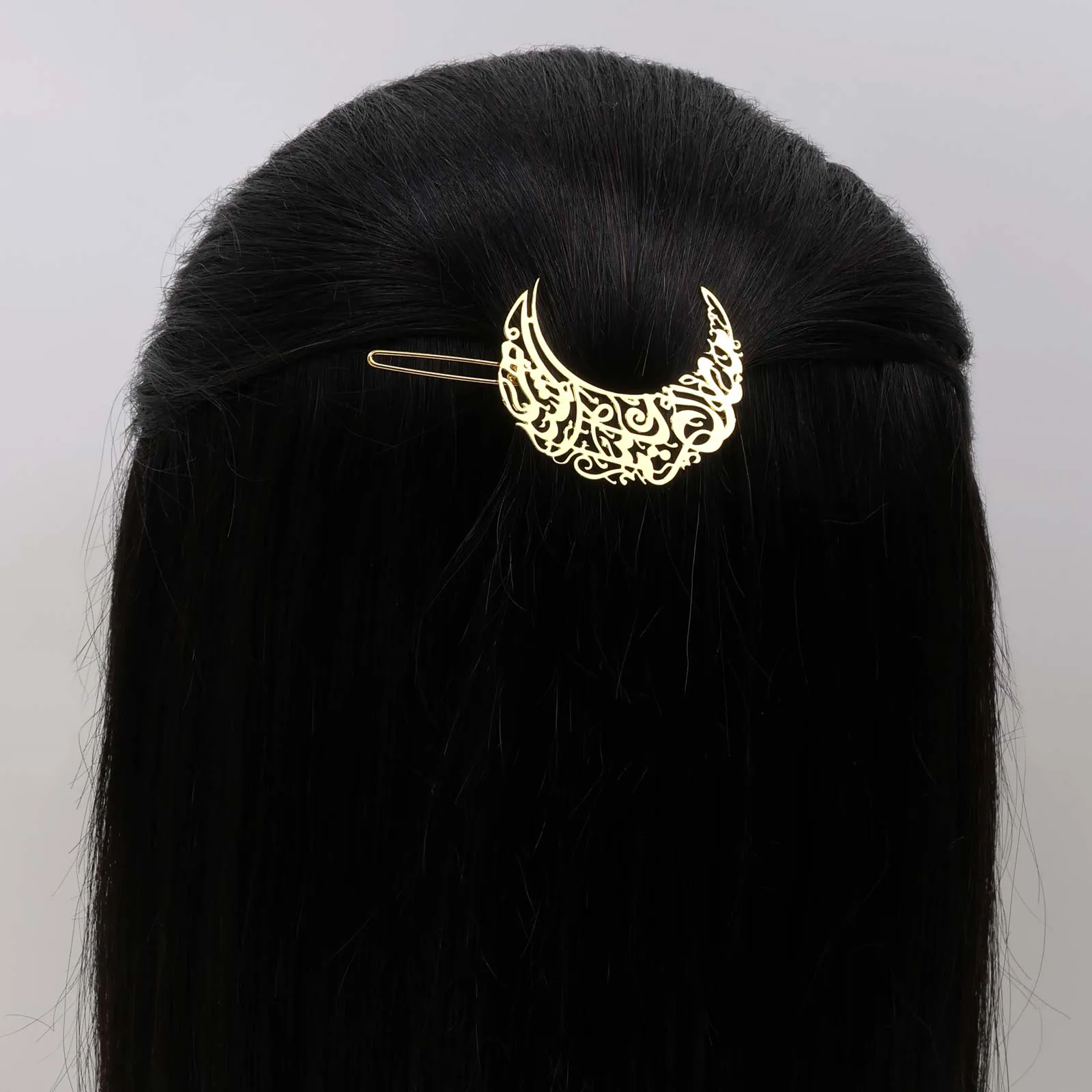Hair Clip featuring an openwork crescent shape with intricate filigree detailing. Designed with a smooth stick pin for secure placement.