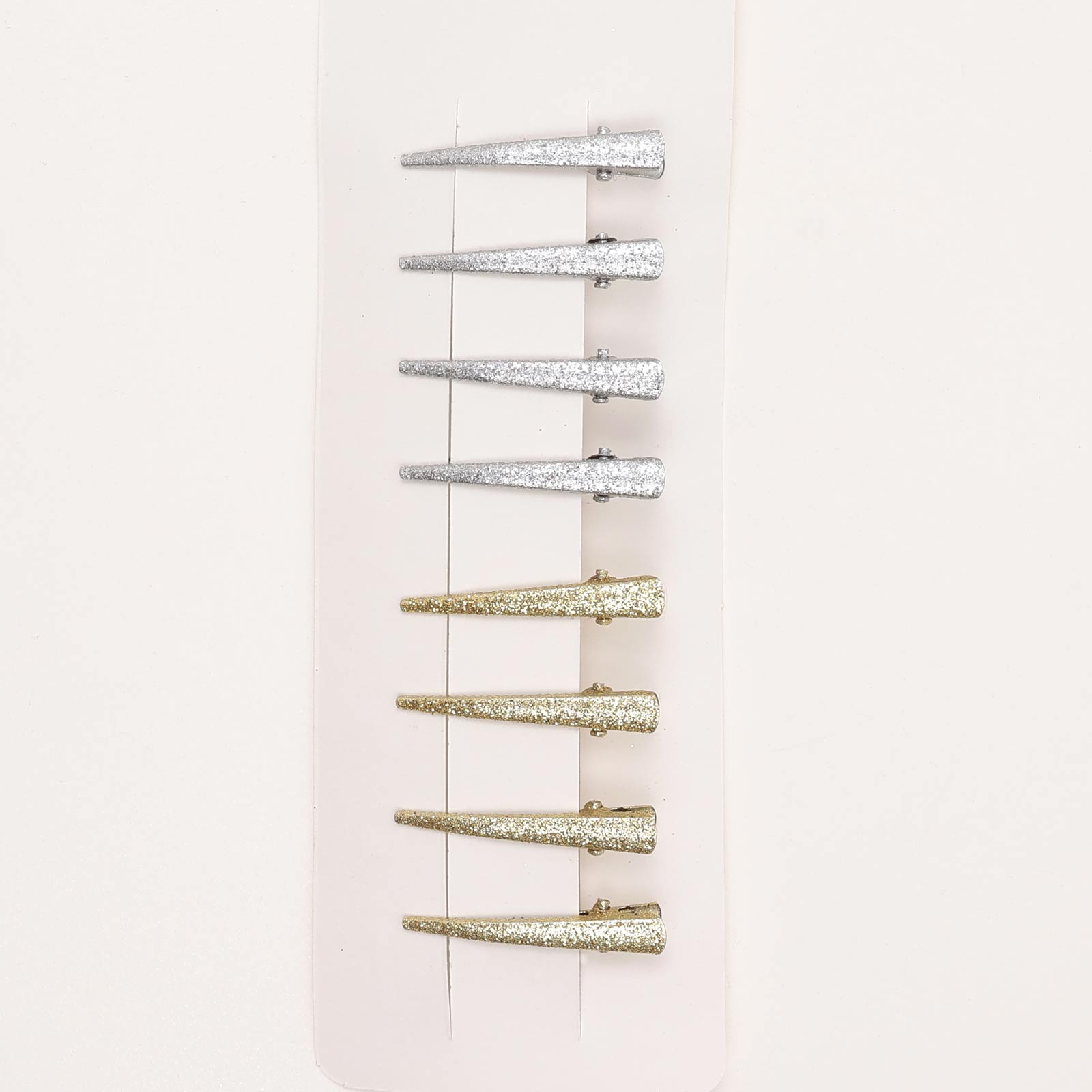 Set of glitter metal hair clips in gold and silver tones.