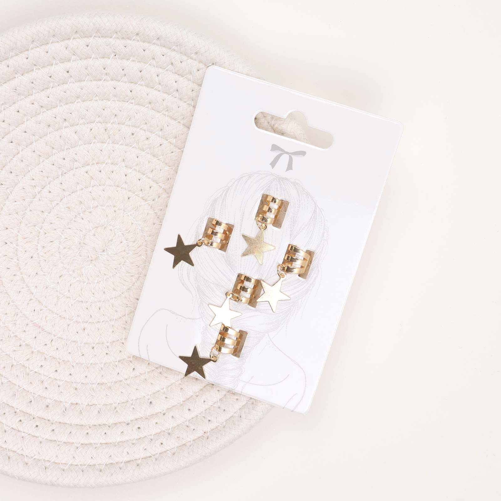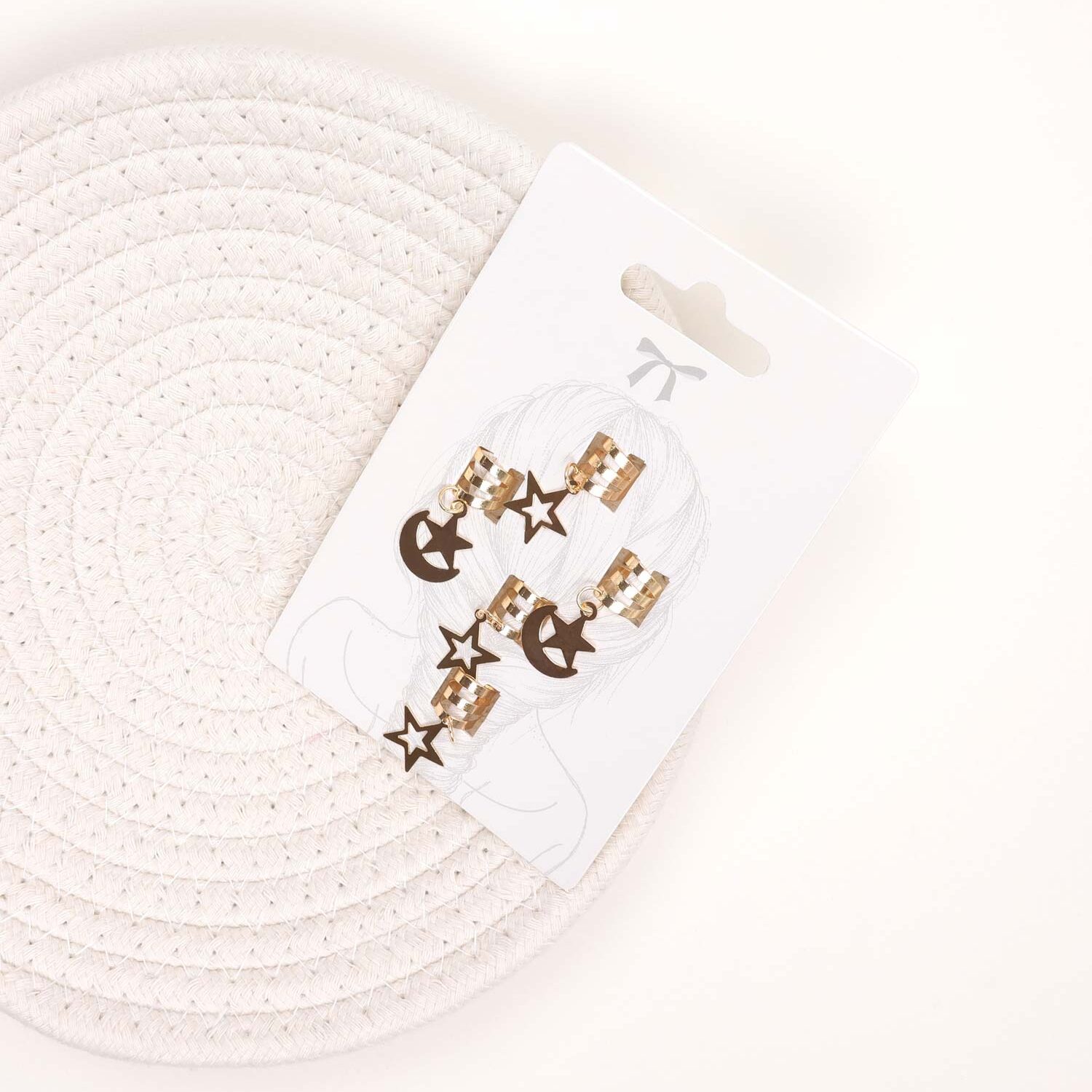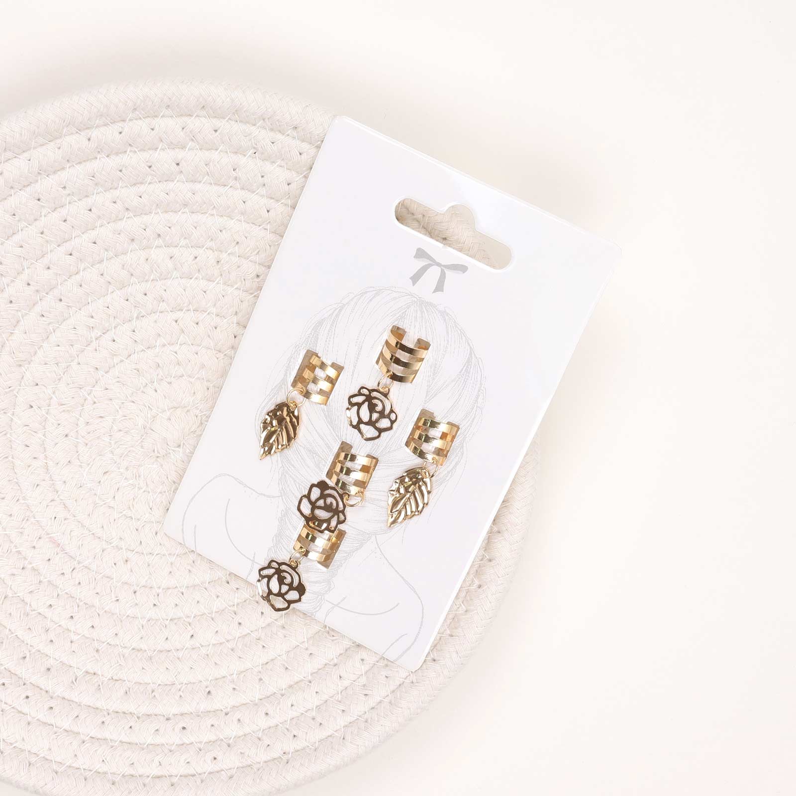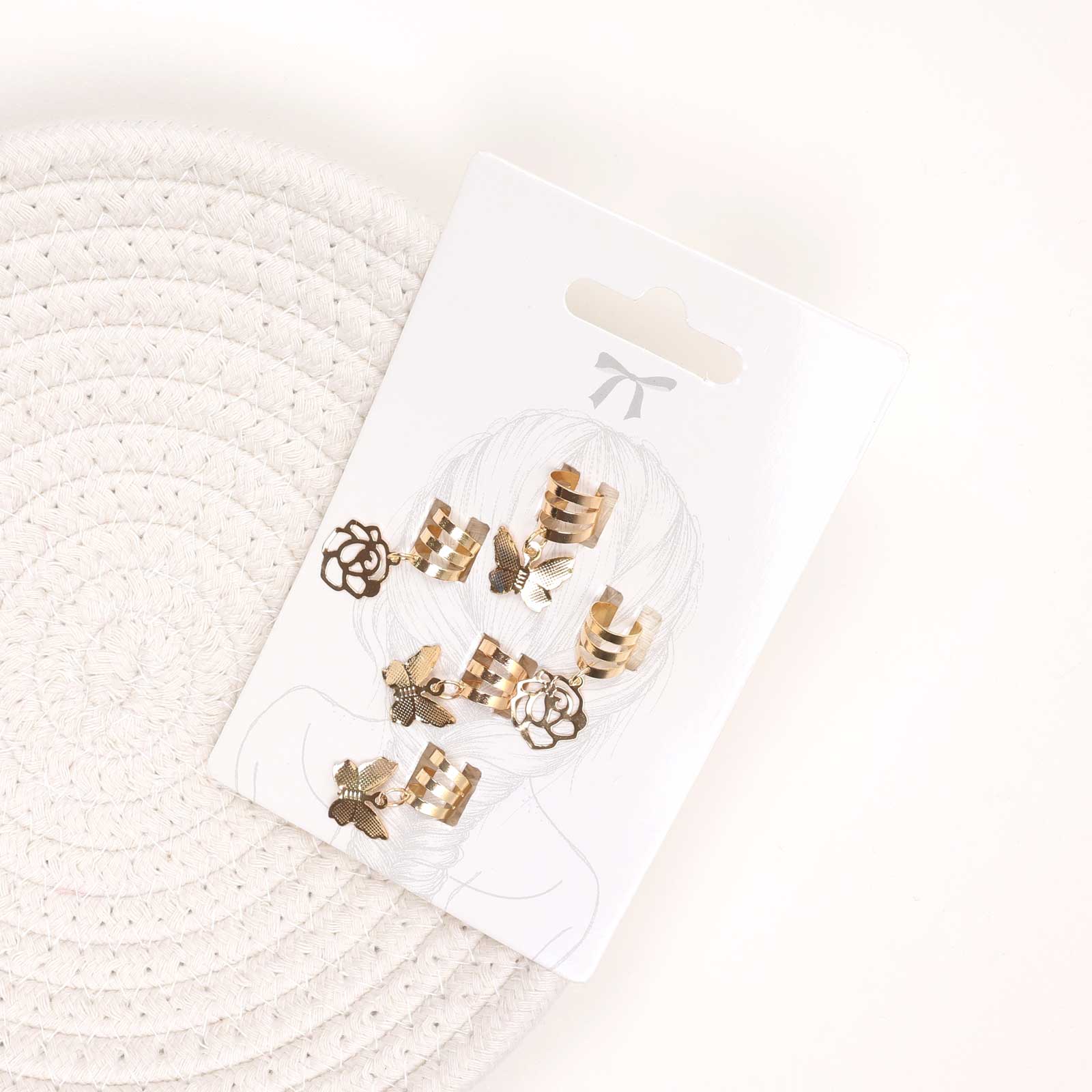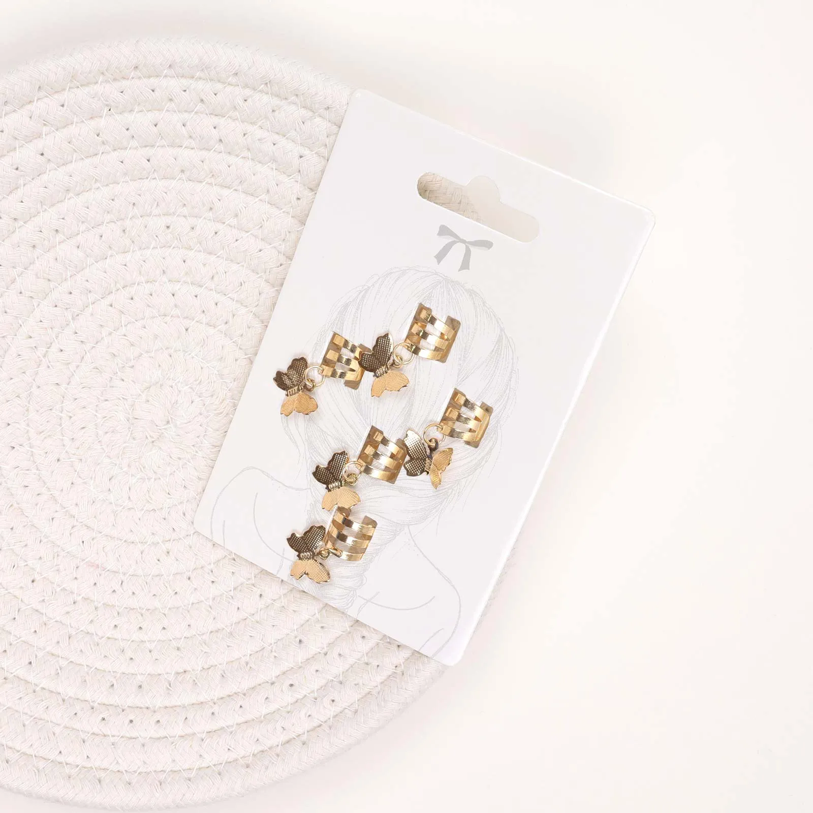 Gold hair rings set featuring delicate butterfly and flower designs. Perfect for braids, twists, and updos, these shiny gold accessories add a touch of charm to any look.