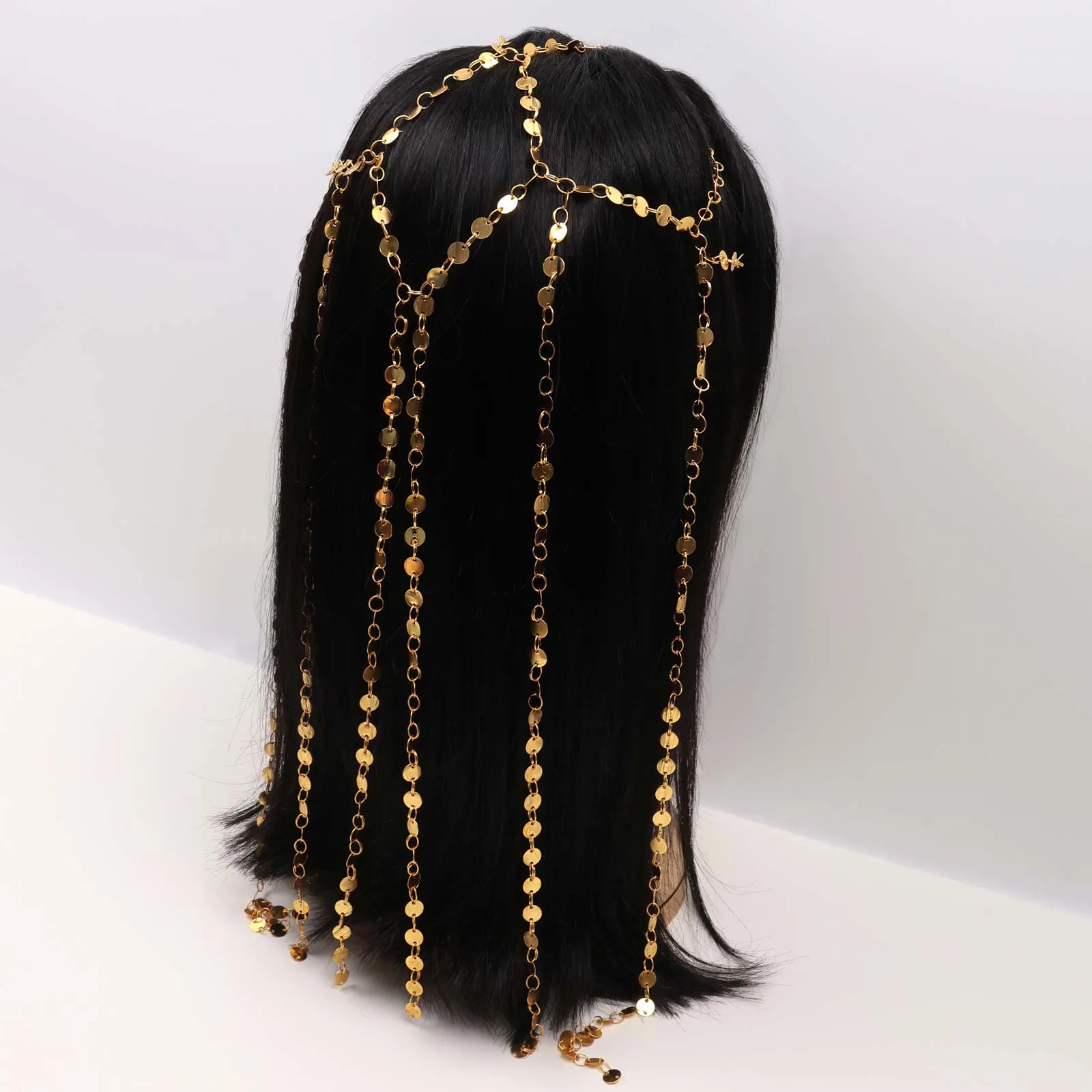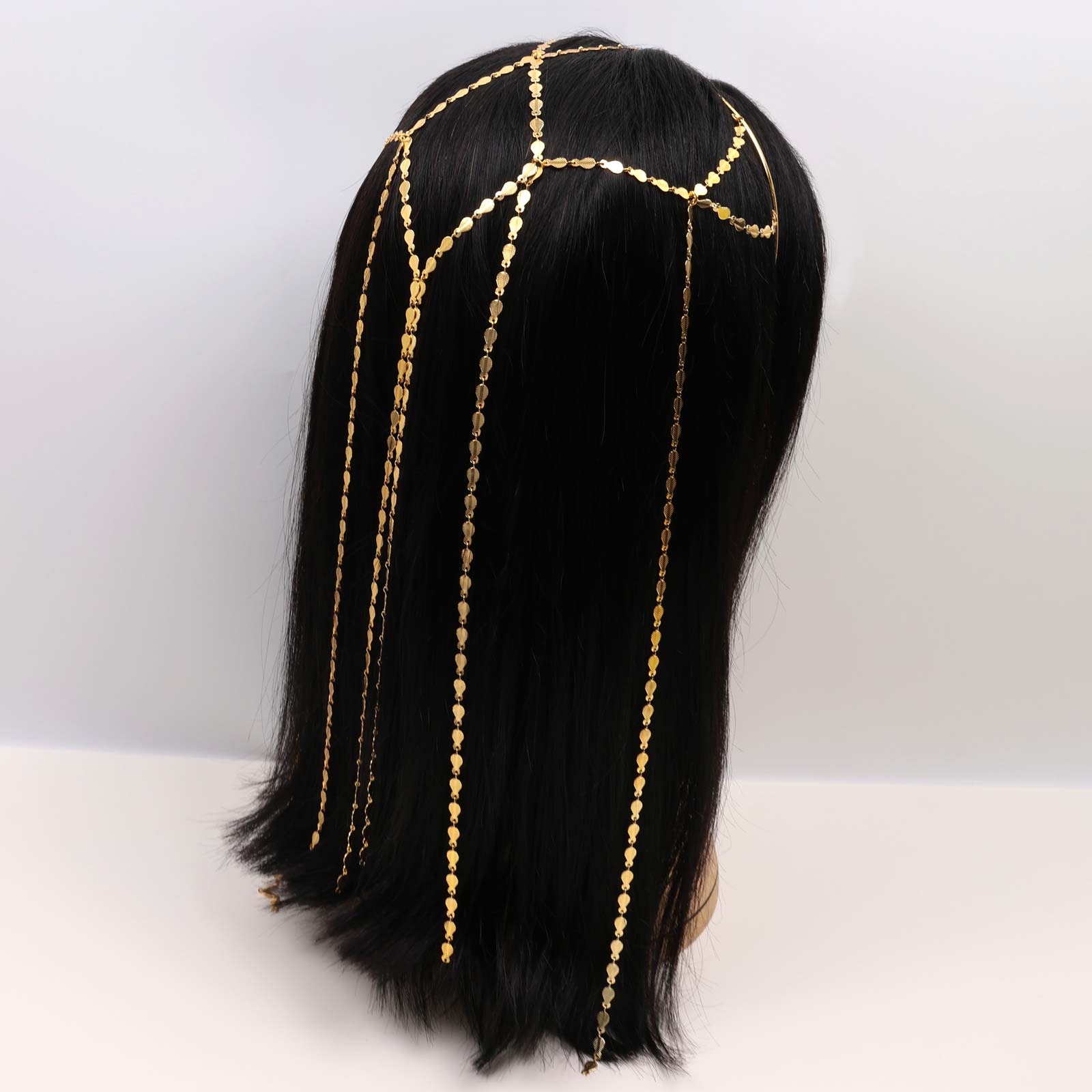 Elegant hairband featuring a gold-tone chain design with spaced hanging strands.