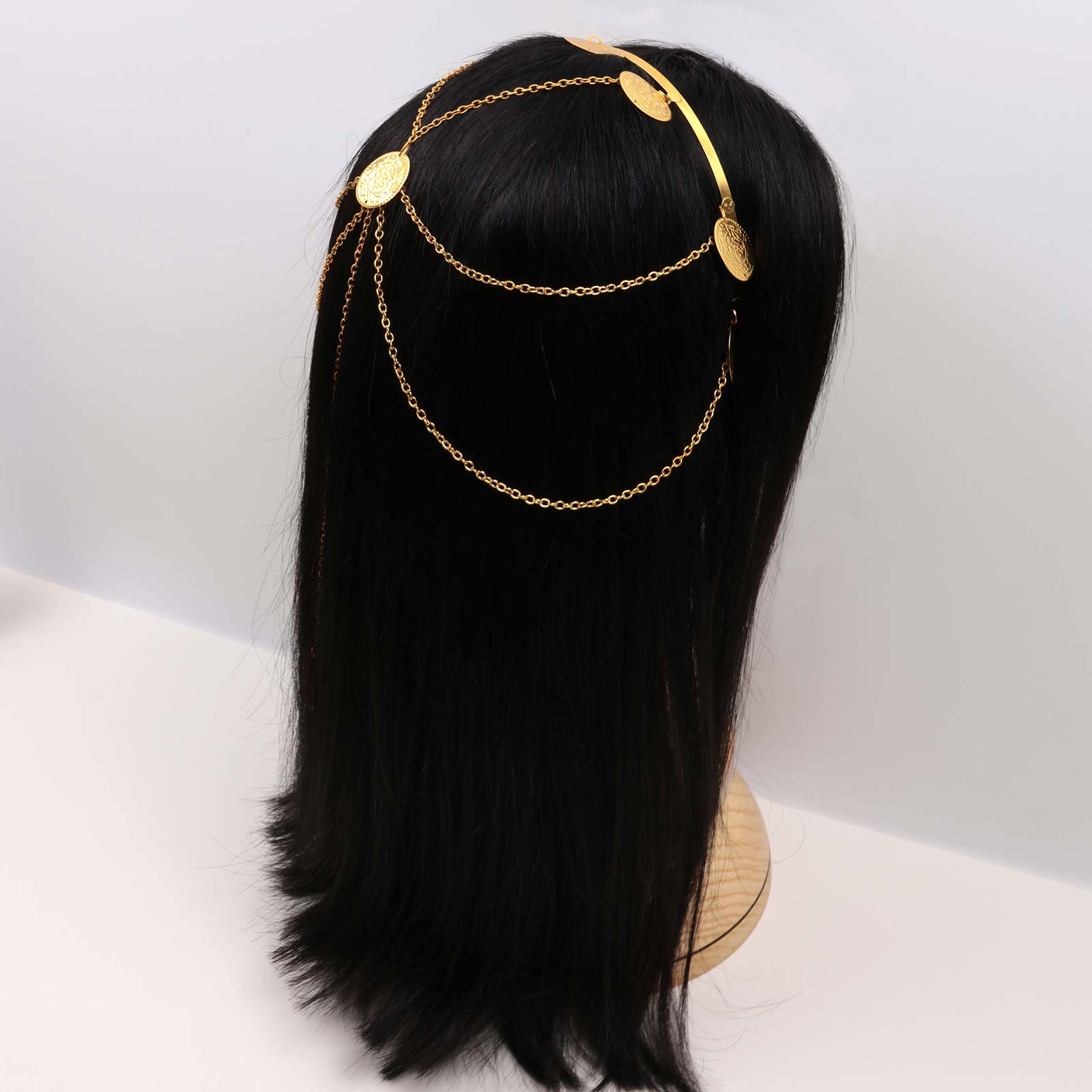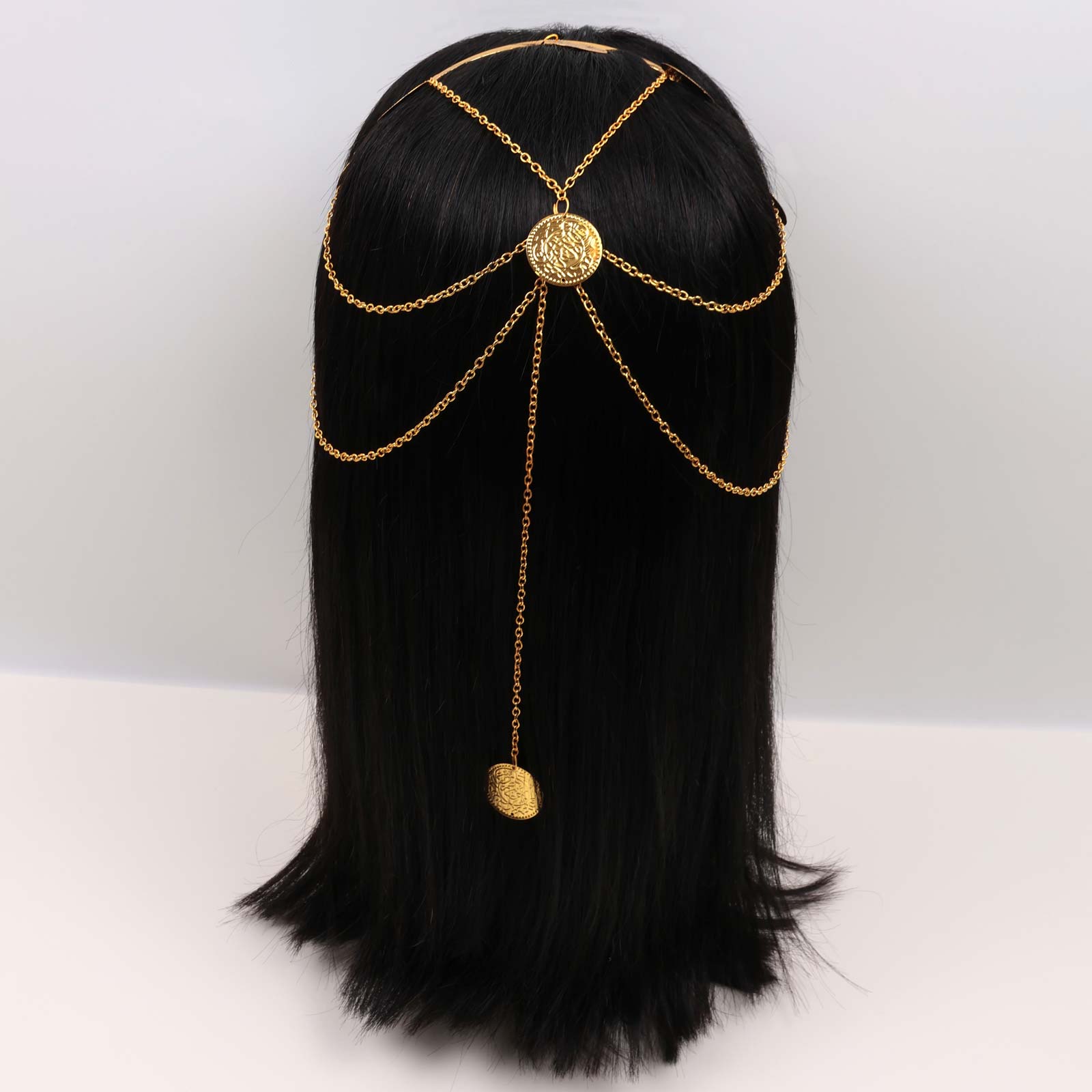 Elegant hairband featuring a gold-tone chain structure with a central round medallion and draped hanging chains.