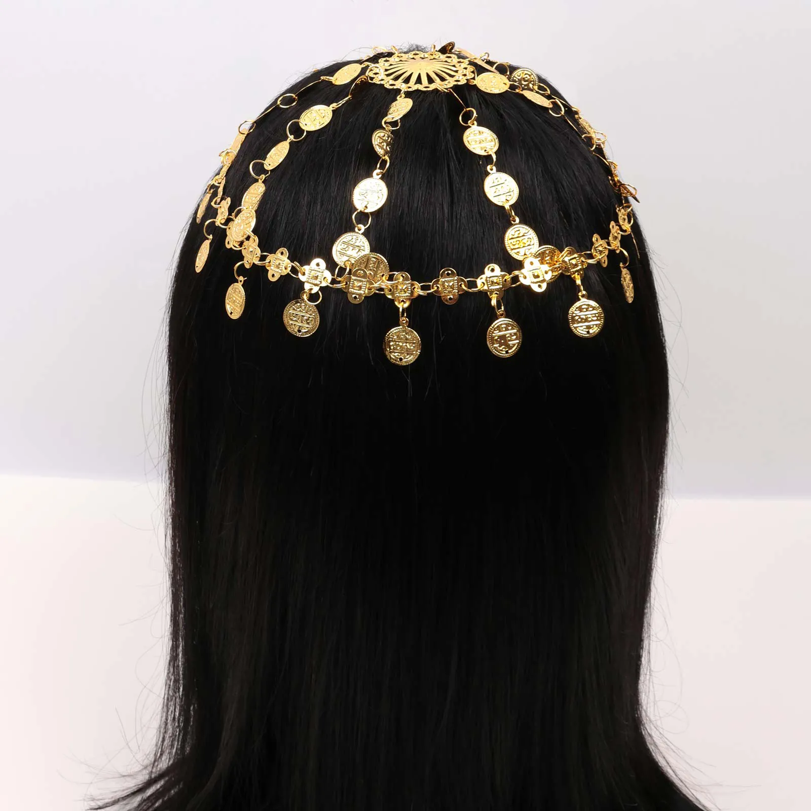 Decorative headpiece featuring a circular top plate with layered chains and embossed coin charms. Suitable for traditional and decorative wear.