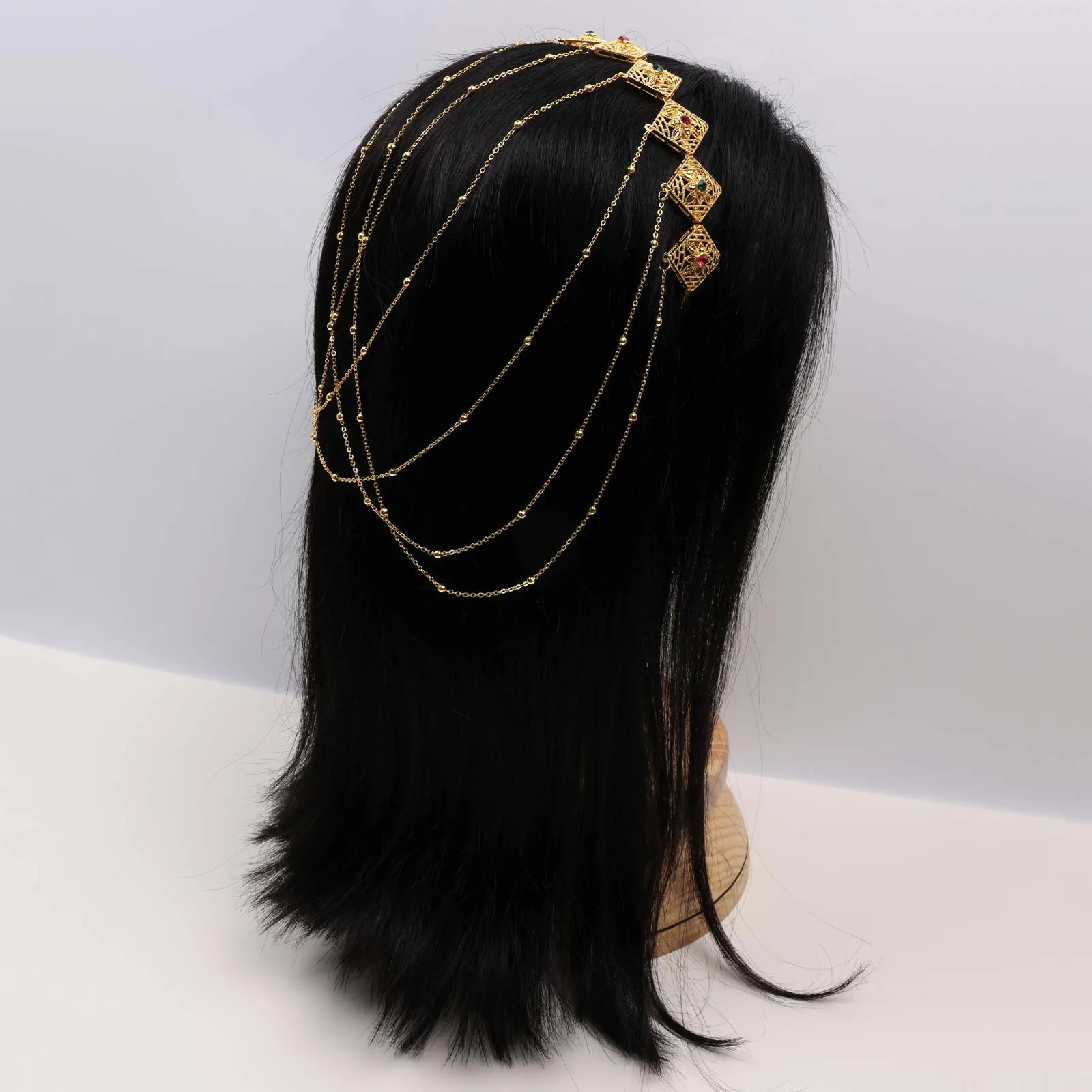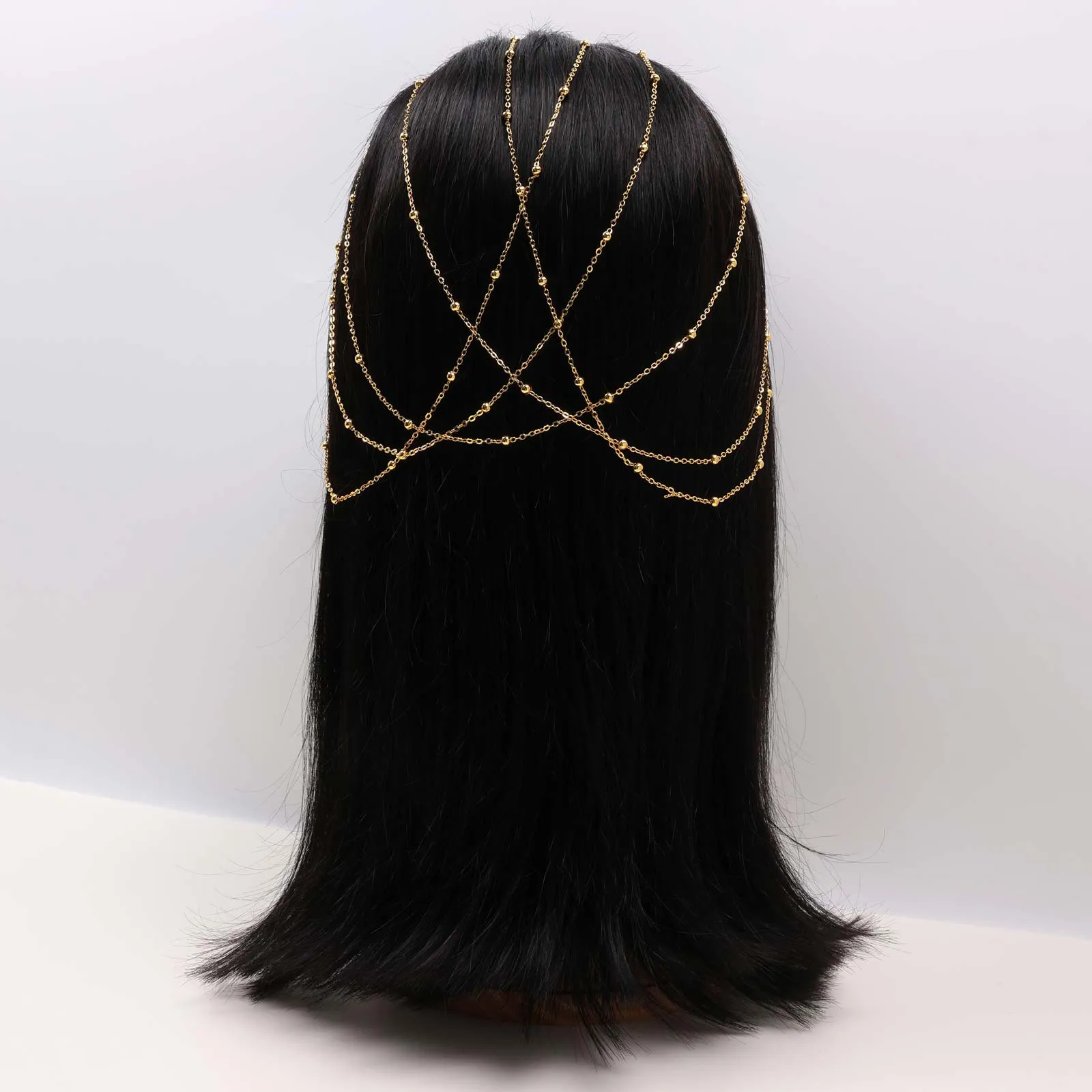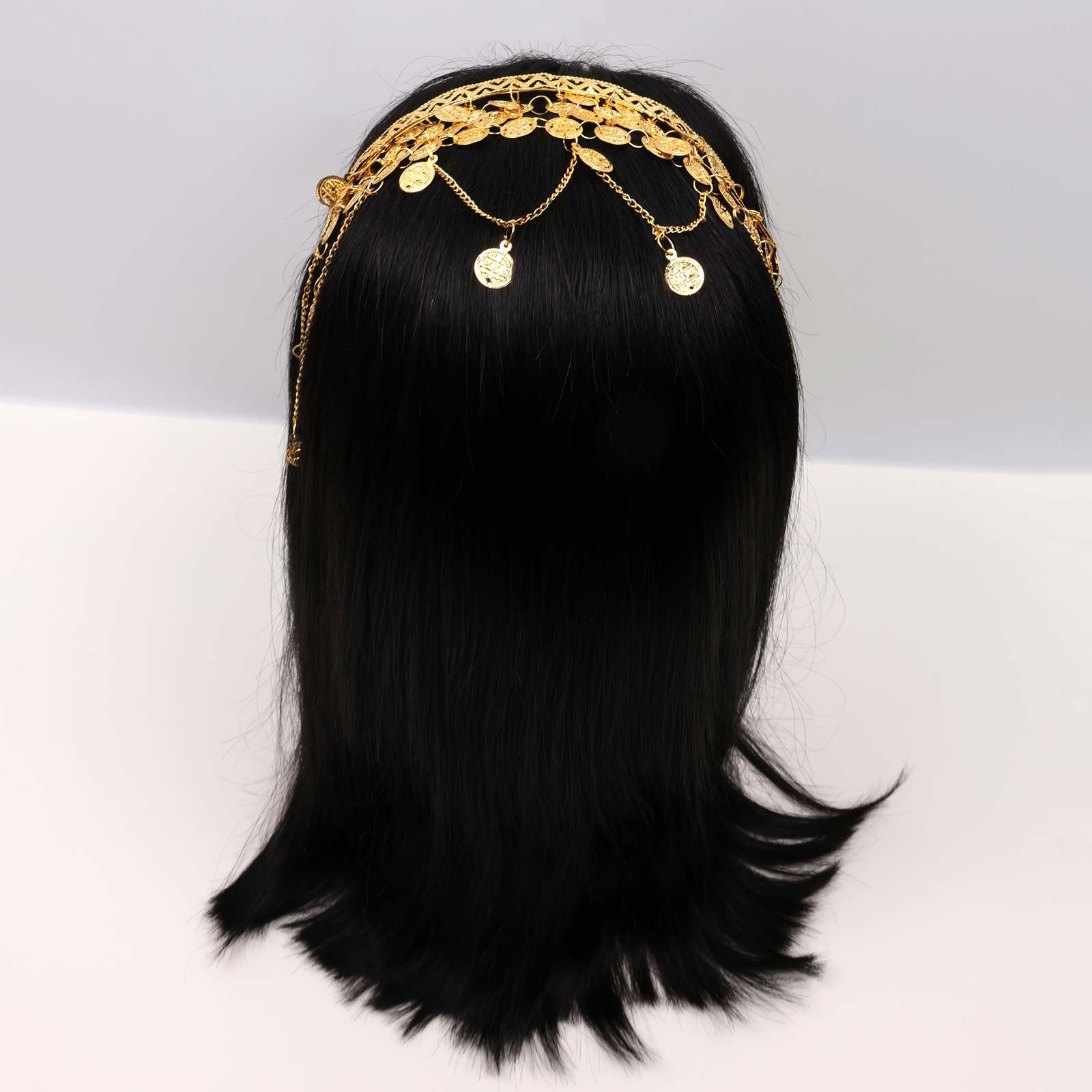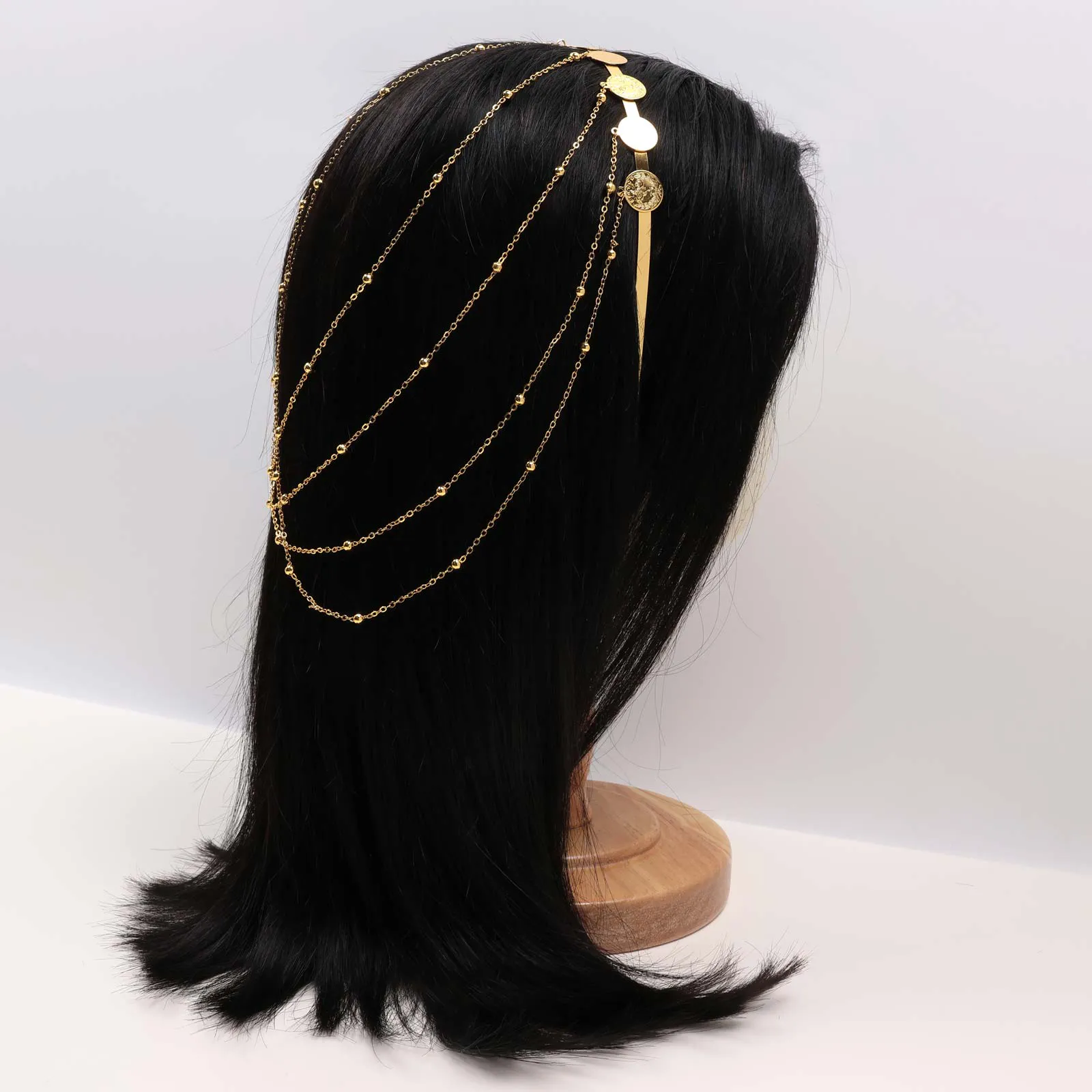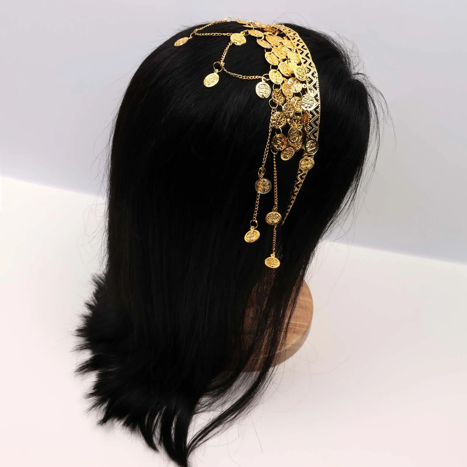 Gold-tone hairband featuring engraved coin charms with layered chain drape detailing.