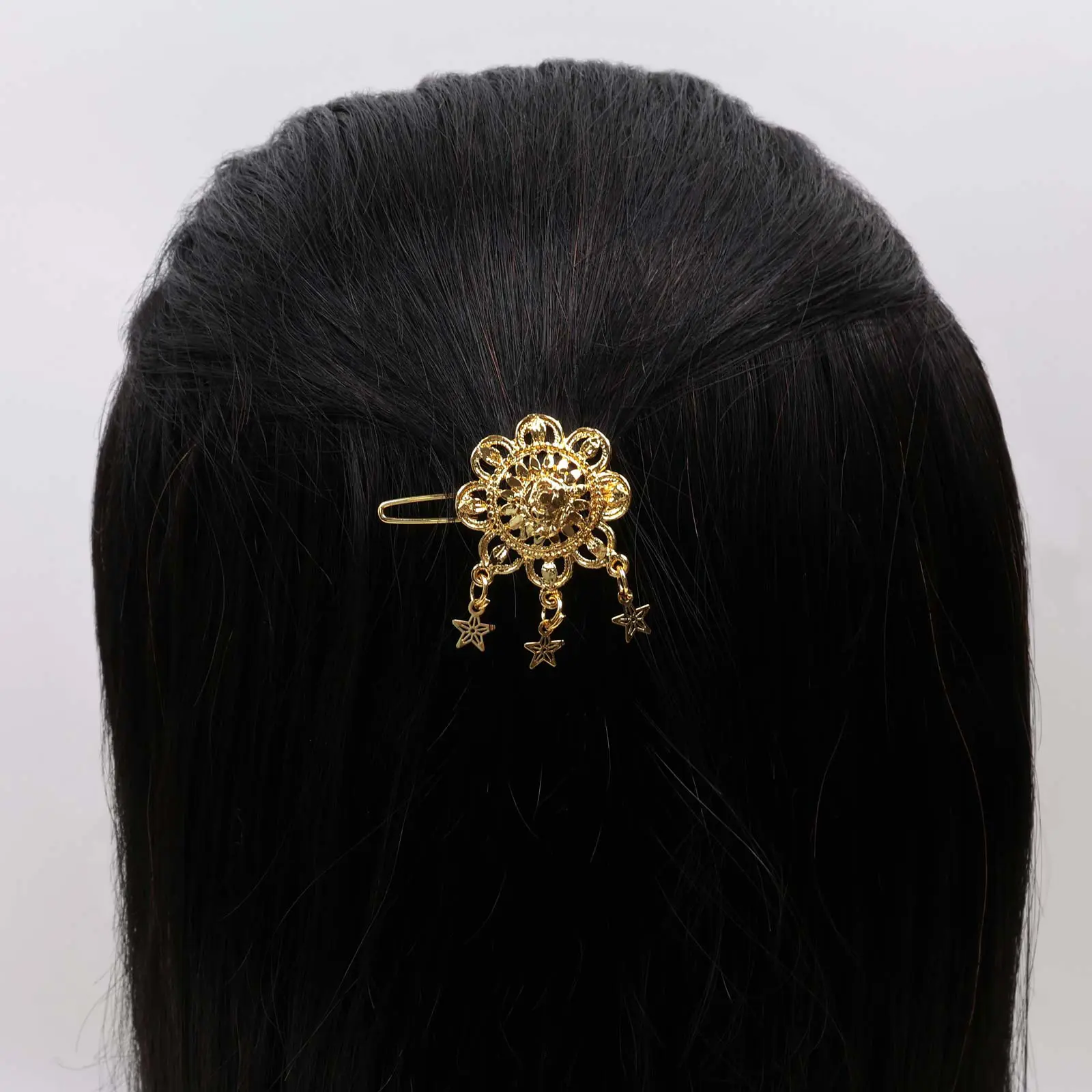 Metal hair clip with a crescent-shaped design, decorative chain drops, and small charm accents in a gold-tone finish.