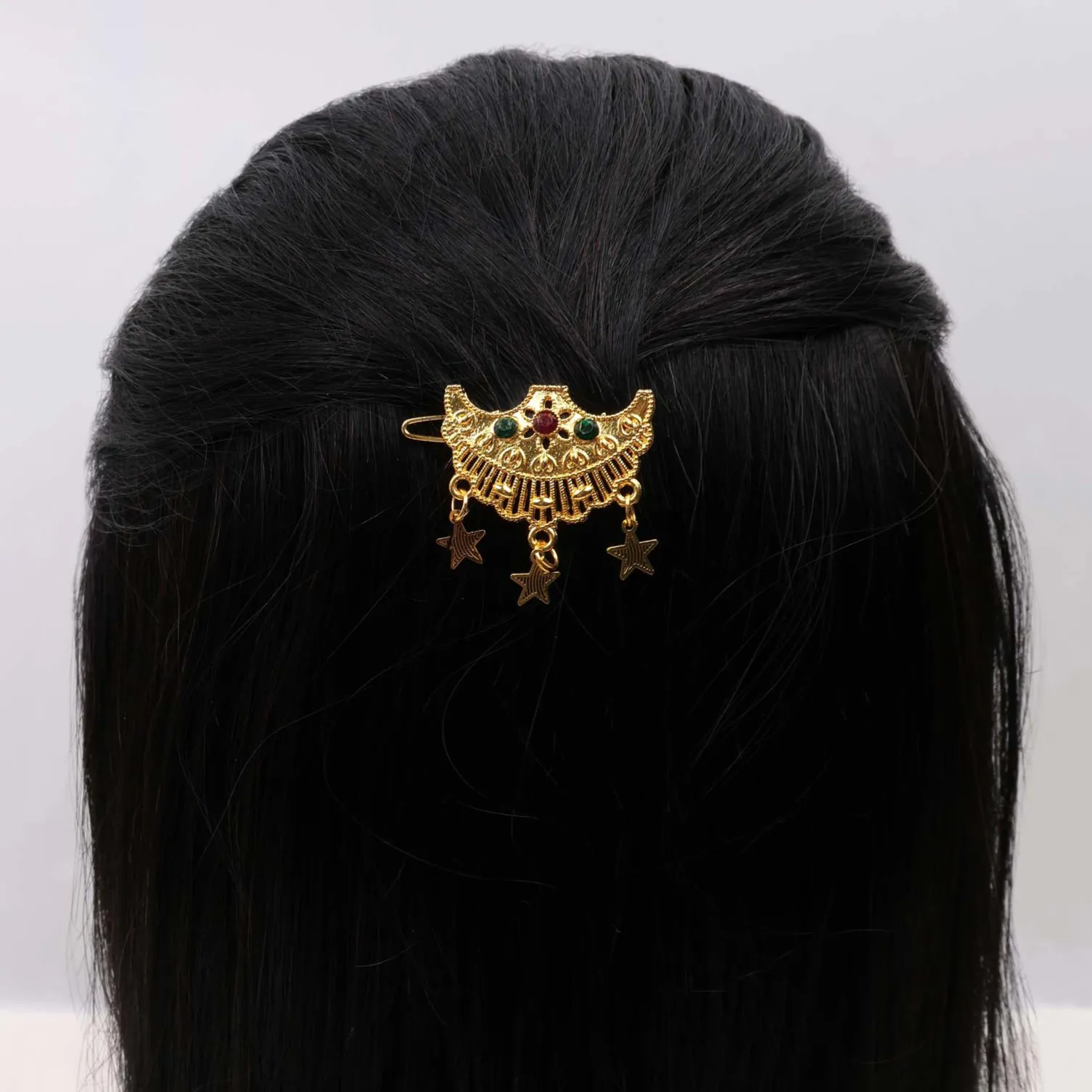 A hair clip with a crescent-shaped design, intricate filigree metal detailing, and a gold-tone finish.