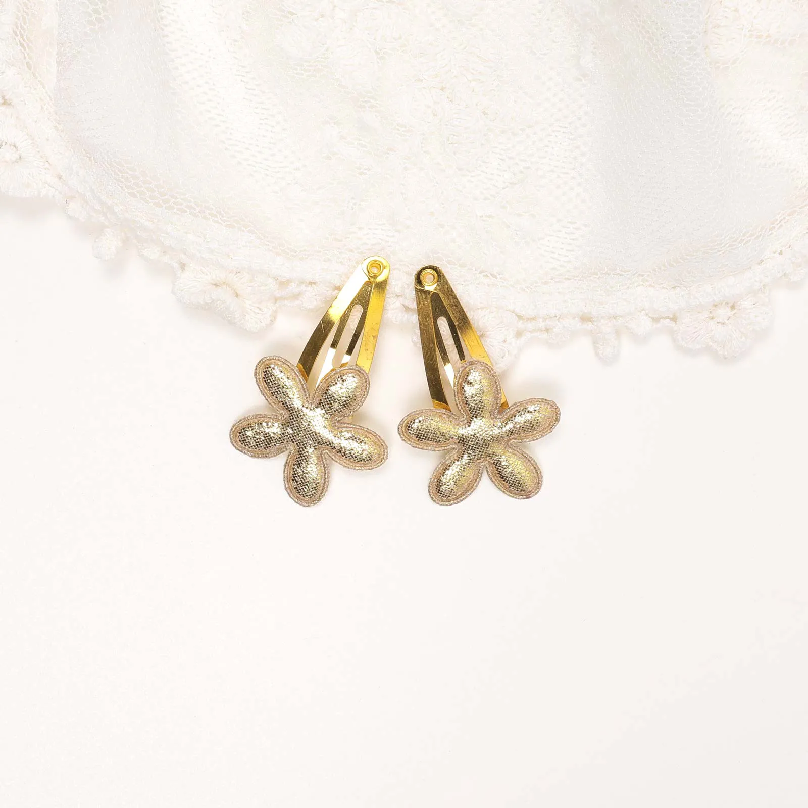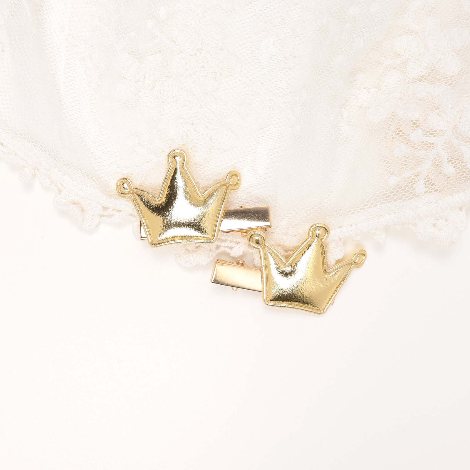 A set of two crown-shaped hair clips finished in a gold glitter surface. Designed with a lightweight structure and smooth clip base.