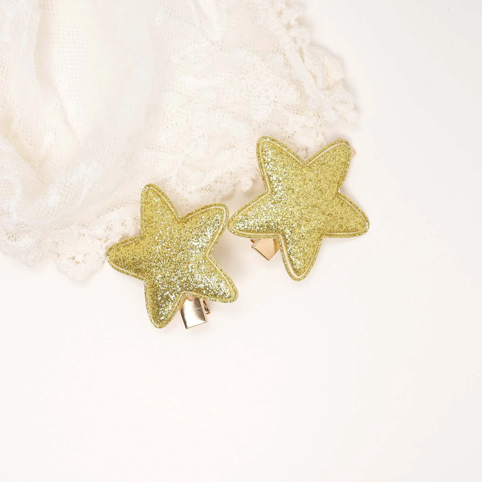 Pair of star-shaped hair clips featuring a gold glitter surface with a smooth backing. Lightweight design with a secure clip mechanism. Suitable for everyday use or special occasions.