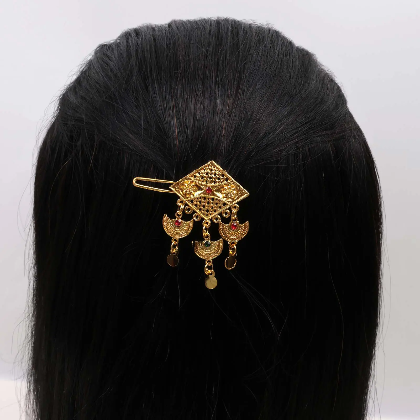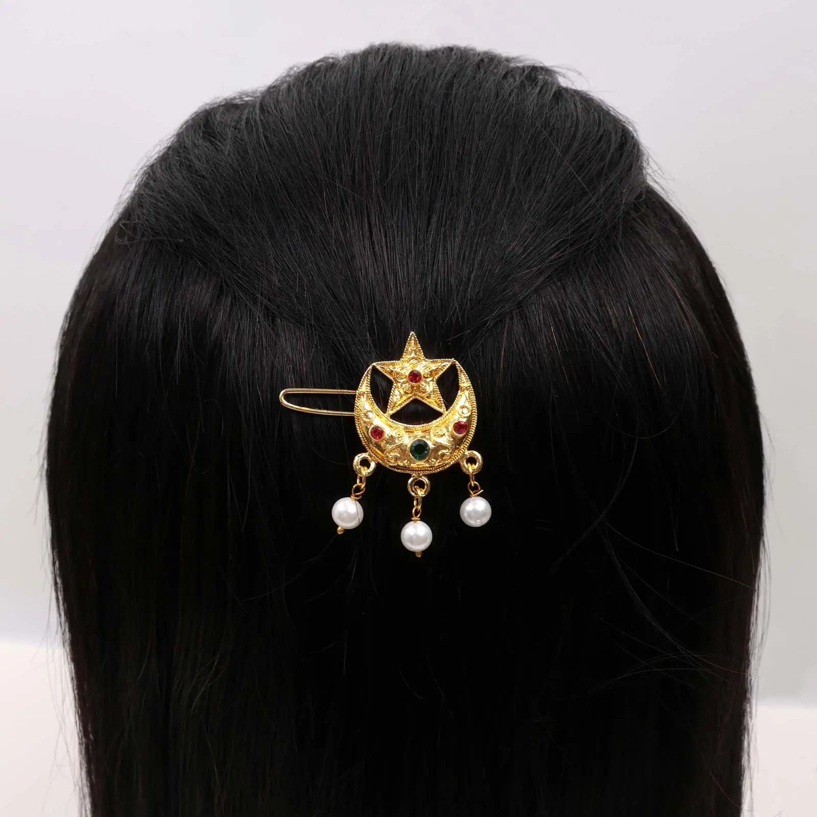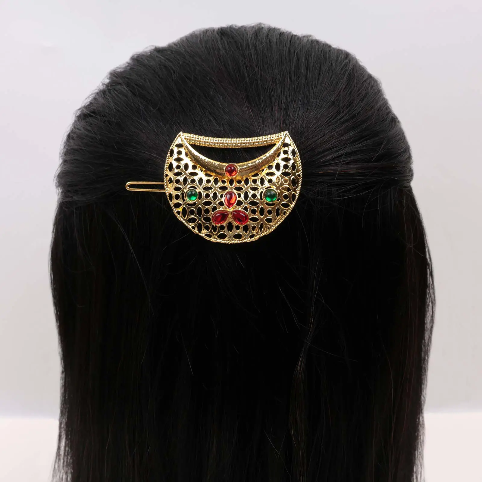Metal hair clip designed in a half-moon shape with an openwork pattern and embedded stone accents. Finished in a gold tone.