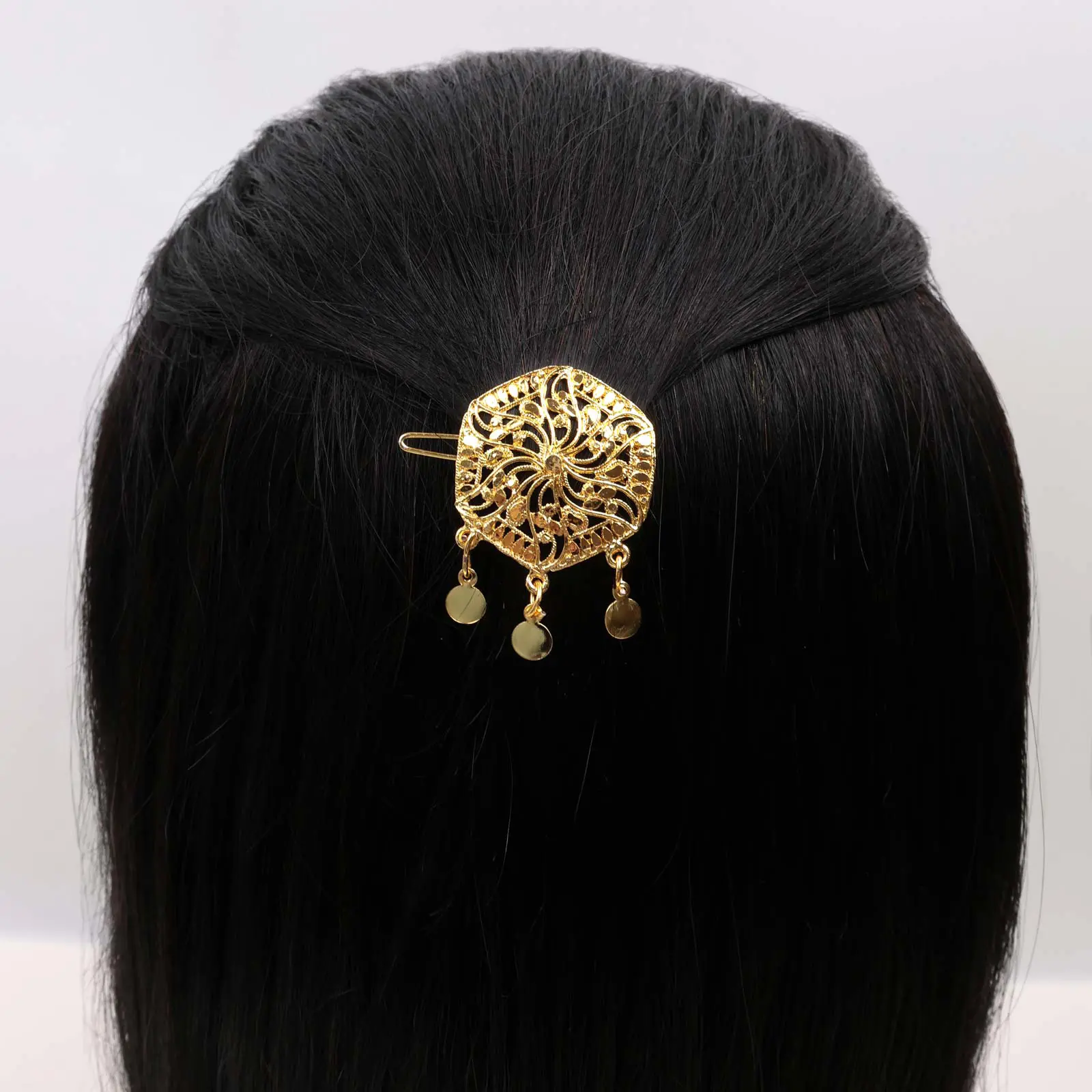 A hair clip featuring a hexagon-shaped filigree design with fine metal detailing and small hanging disc accents. Finished in a gold tone.