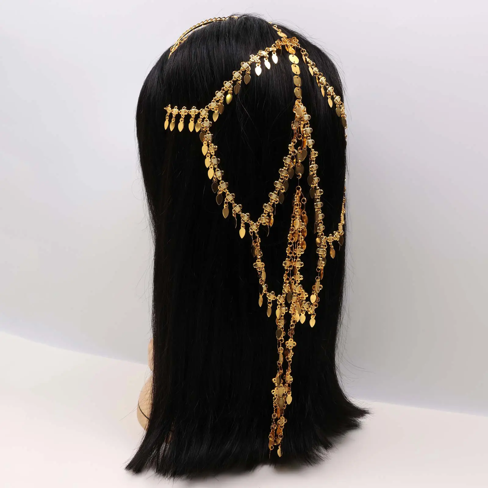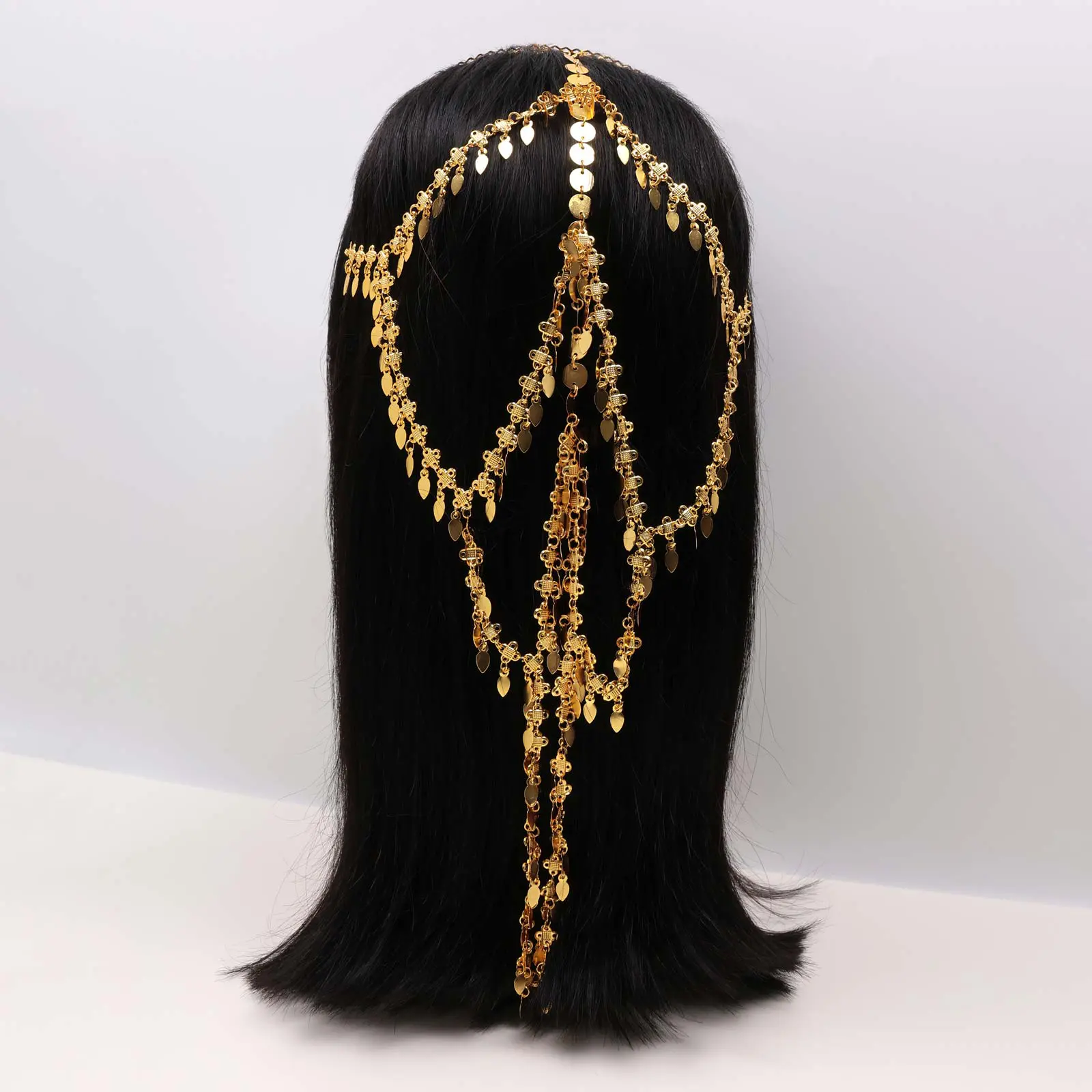 Gold-tone hairband designed with layered chain drapes and a coin patterns in middle.