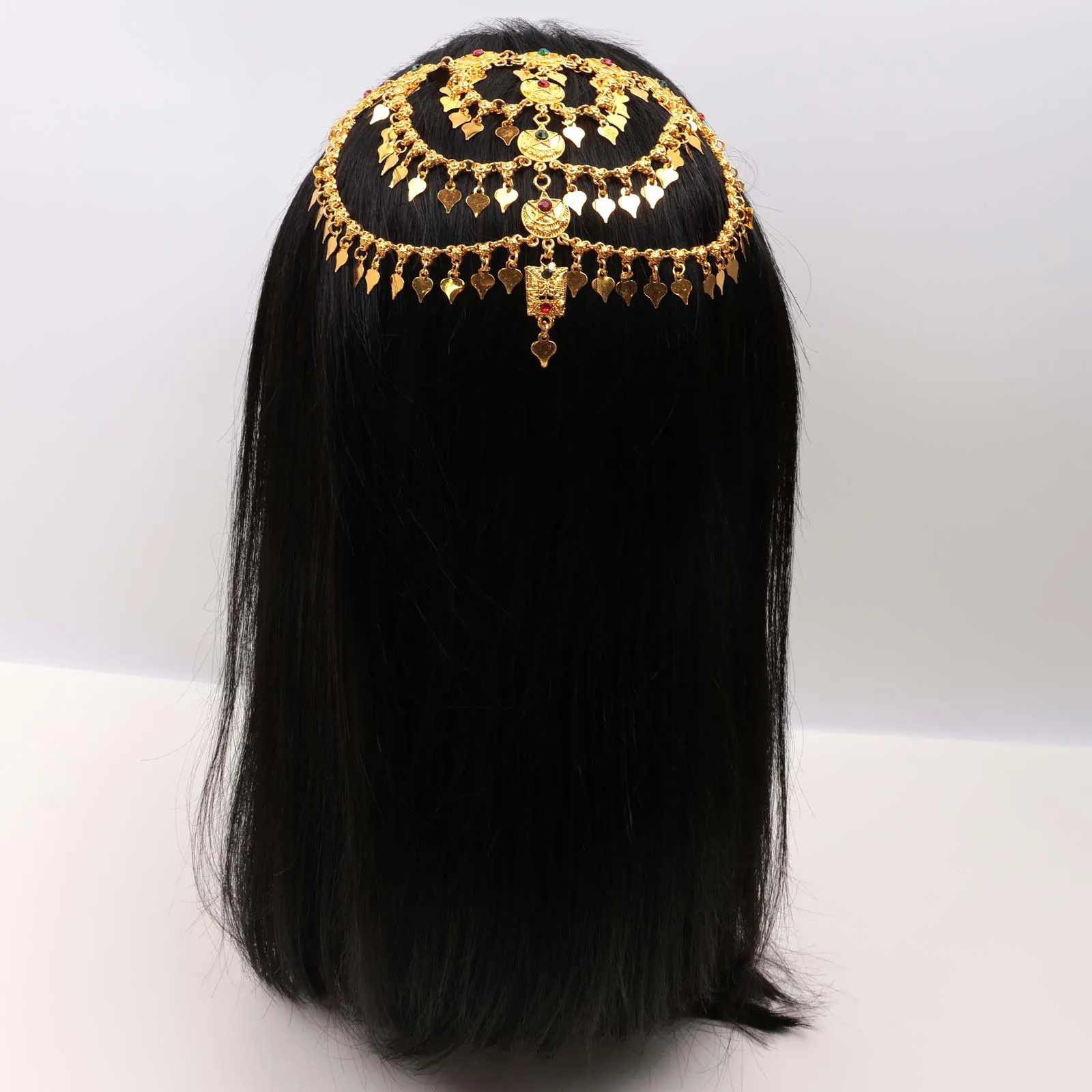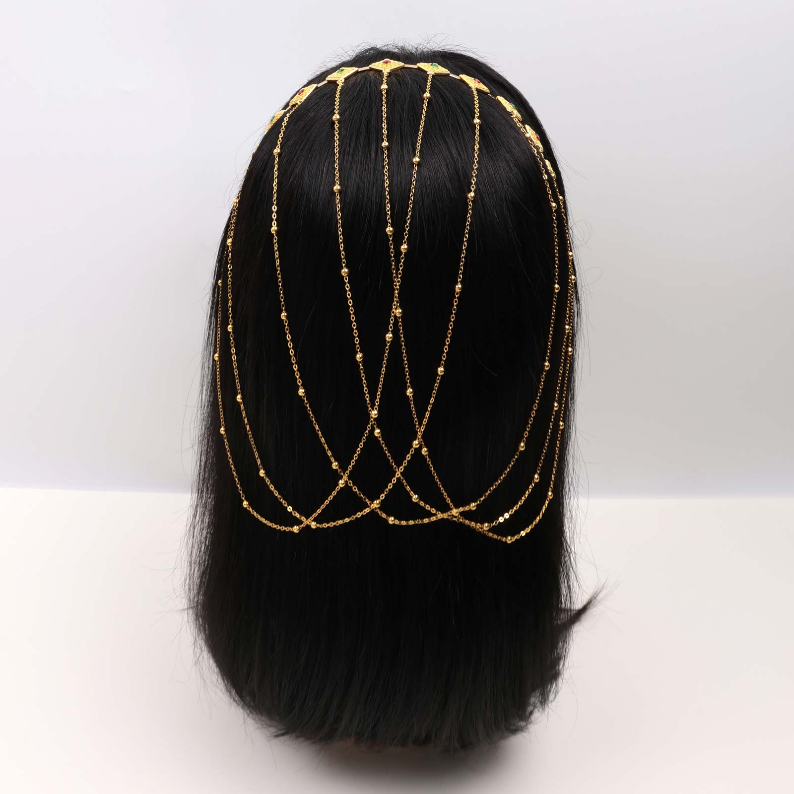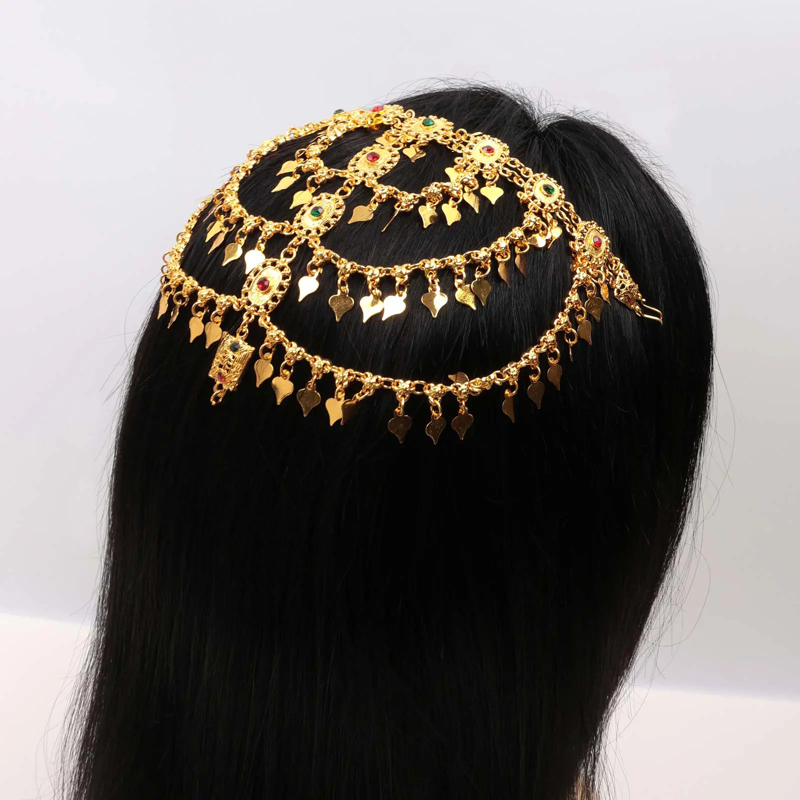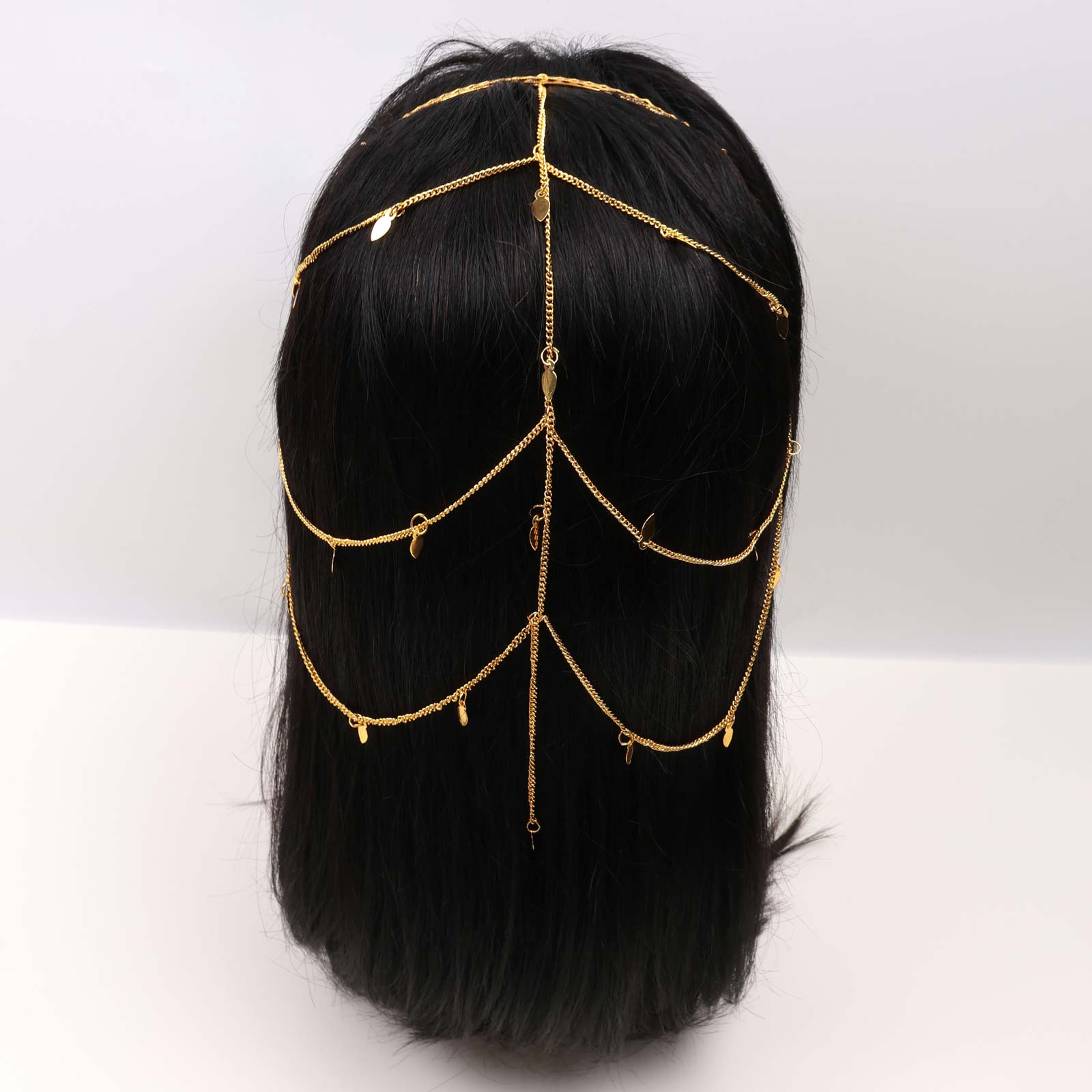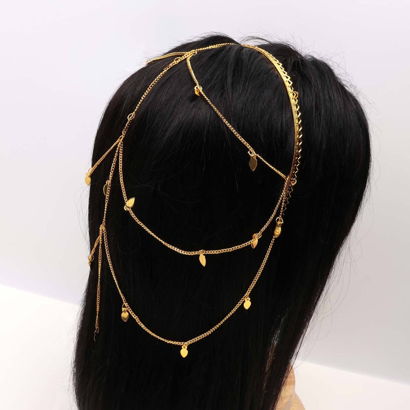 Gold-tone hairband designed with layered chains and hanging leaf-shaped charms, finished with decorative accents.
