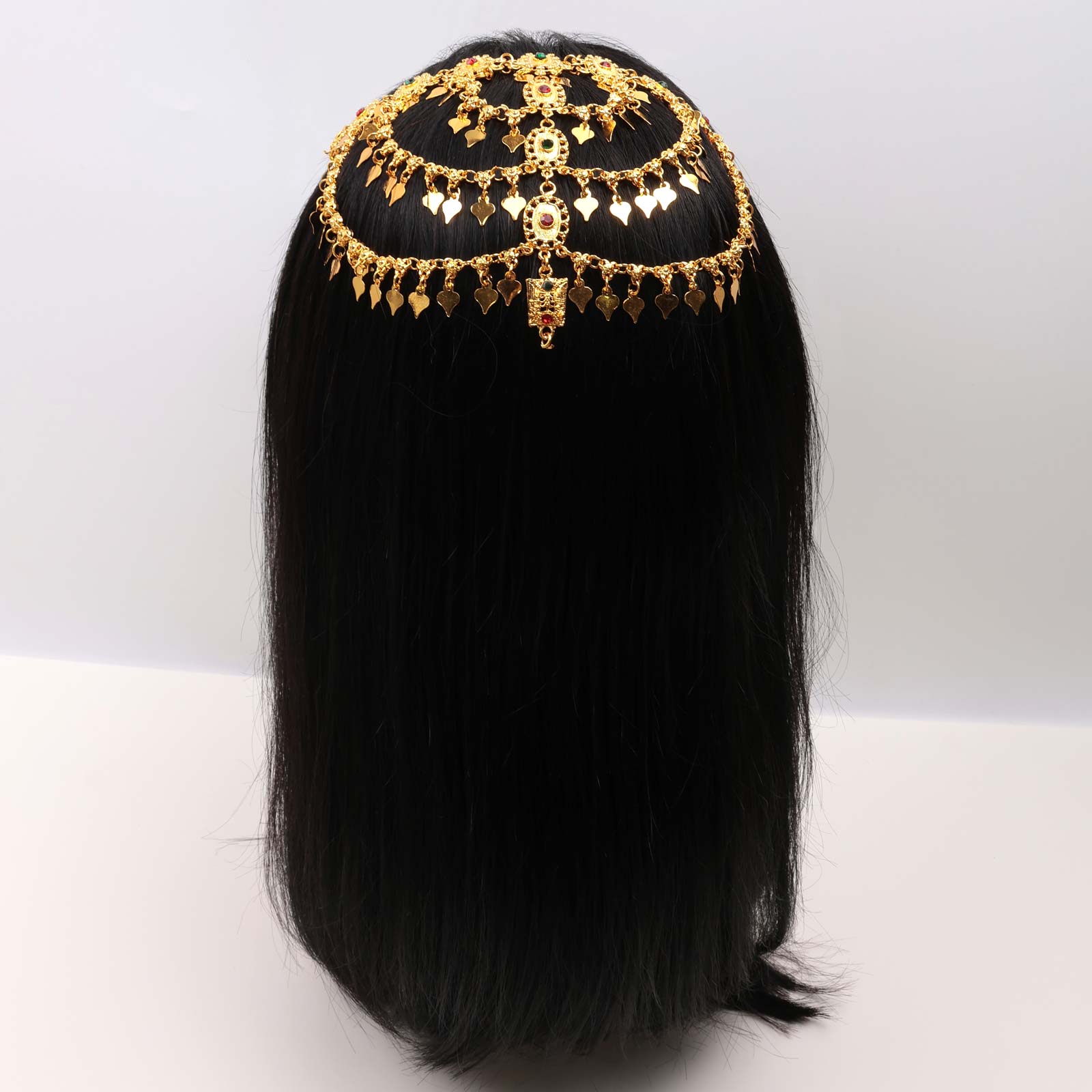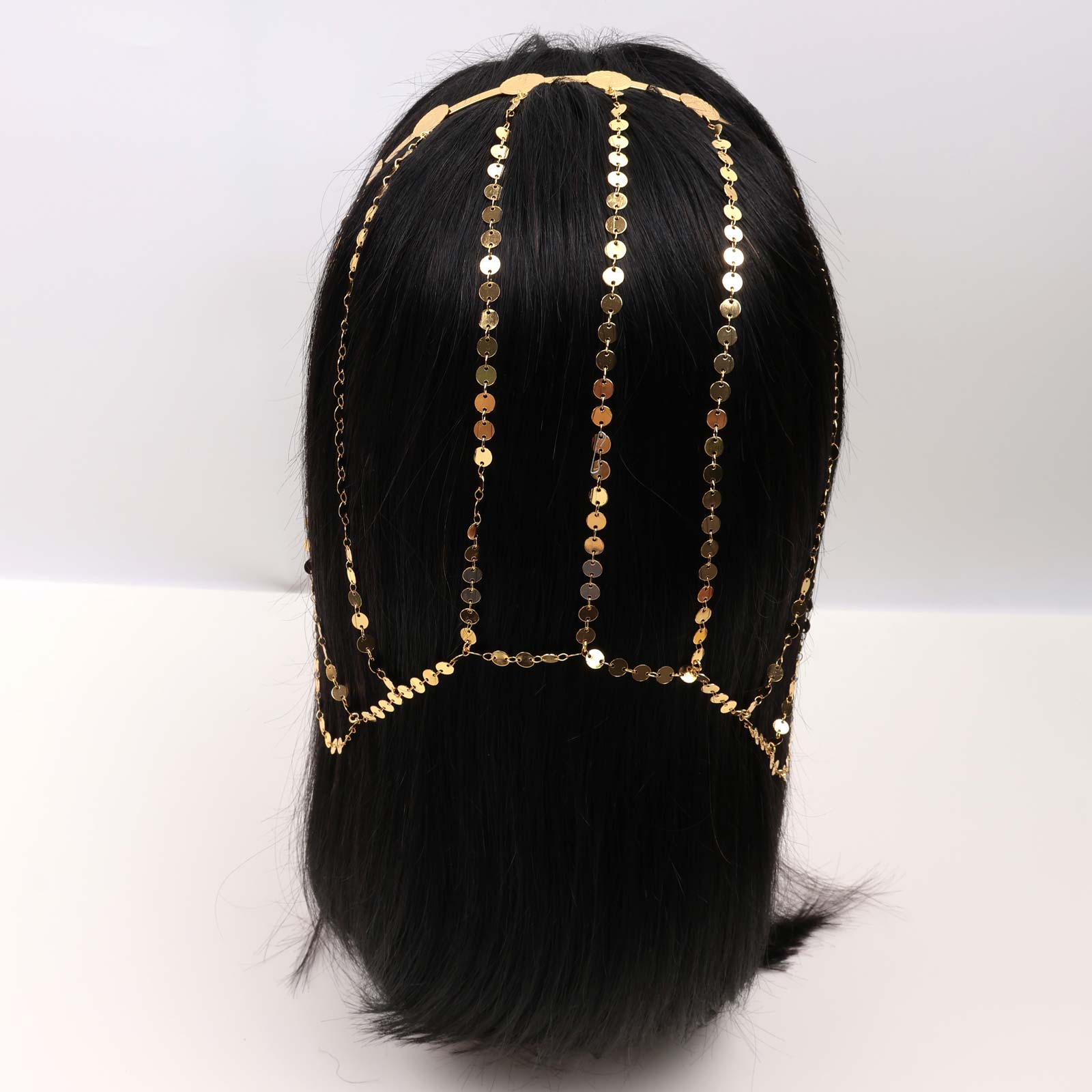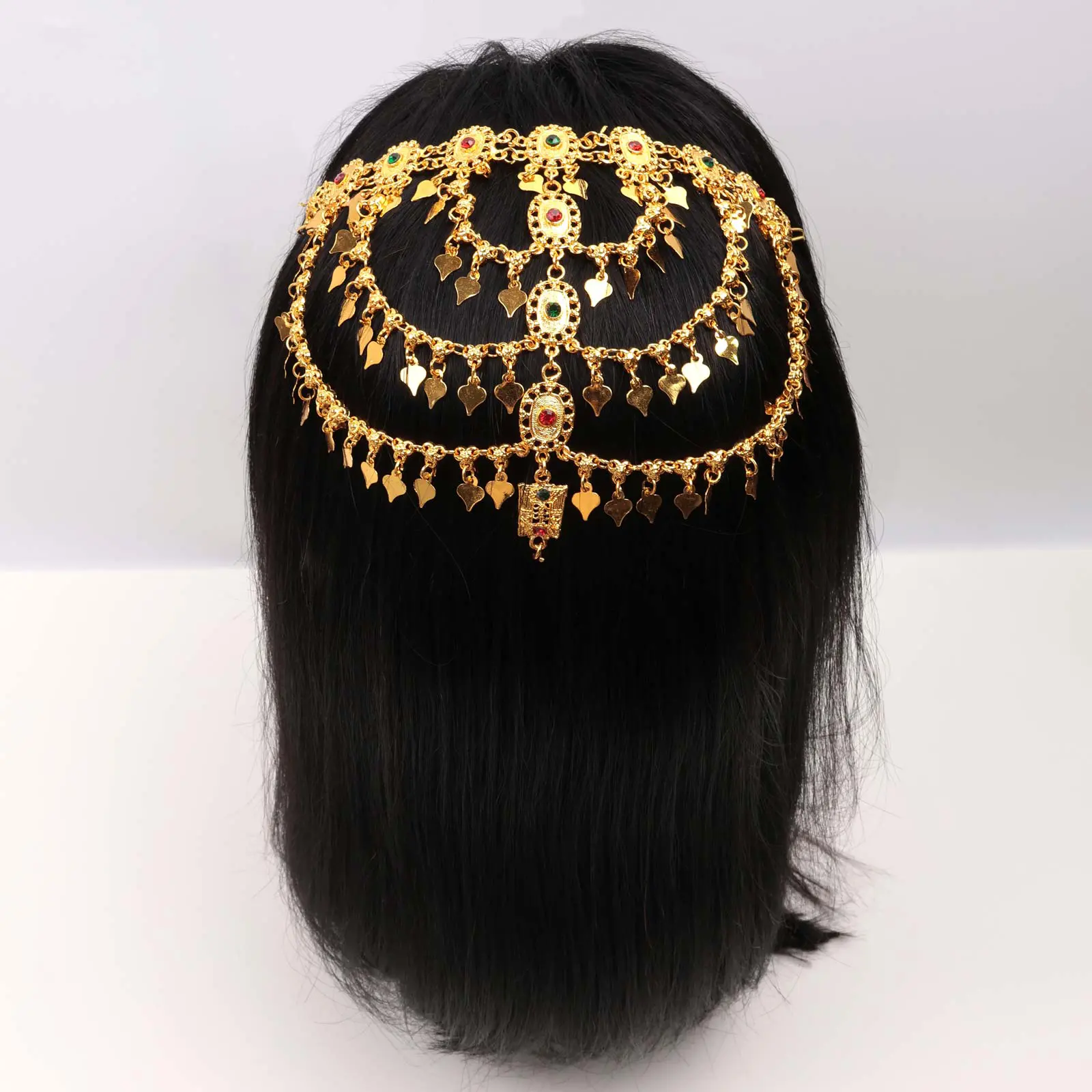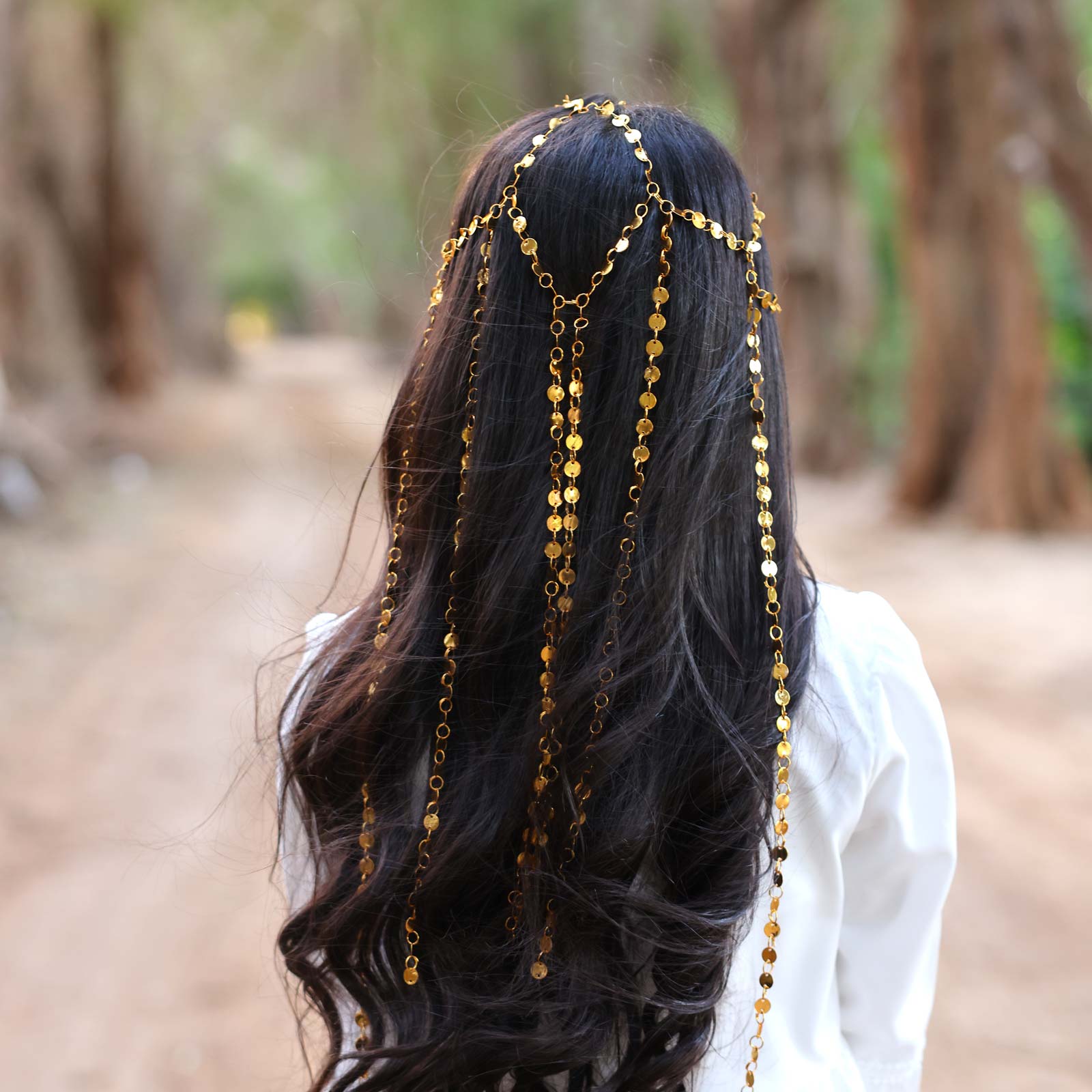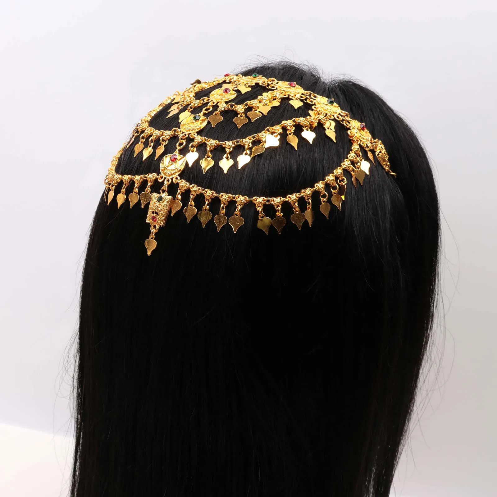 Gold-tone hairband designed with layered chains and hanging leaf-shaped charms, finished with decorative accents.