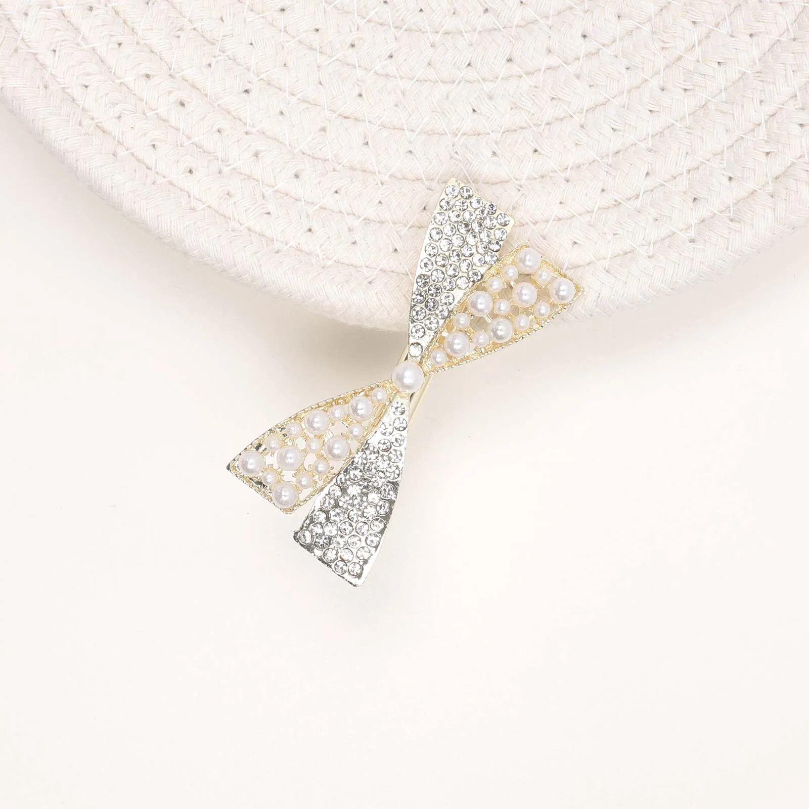 Metal hair clip in a gold-tone finish featuring a bow design with pearl and crystal embellishments. Secure clasp for a firm hold.