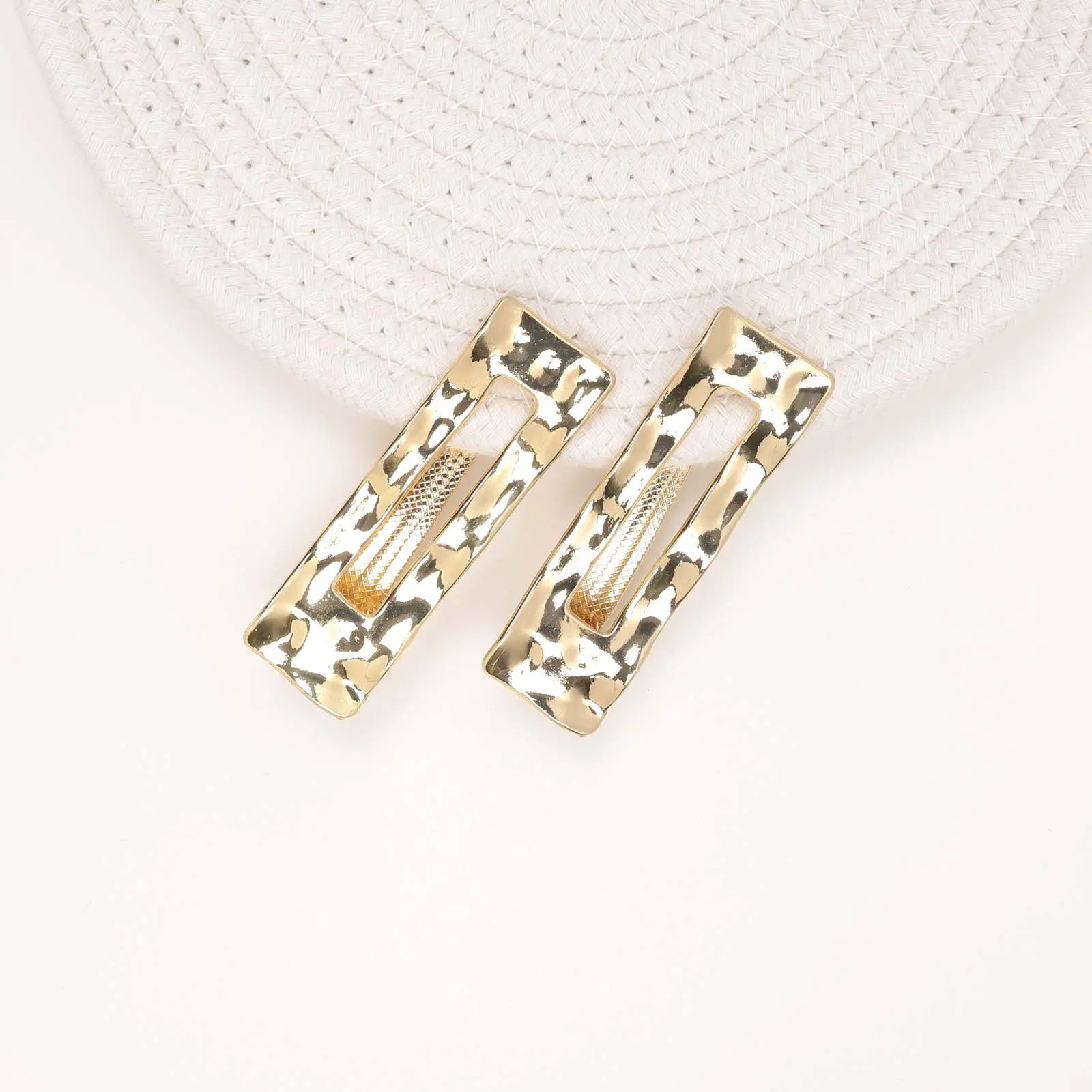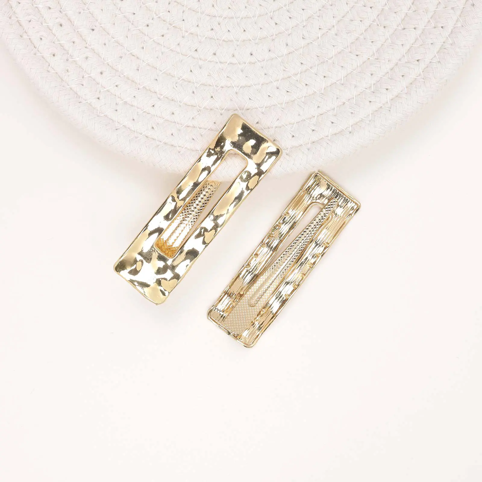 Stylish gold metal snap hair clips with a rectangular hollow design and textured center grip.