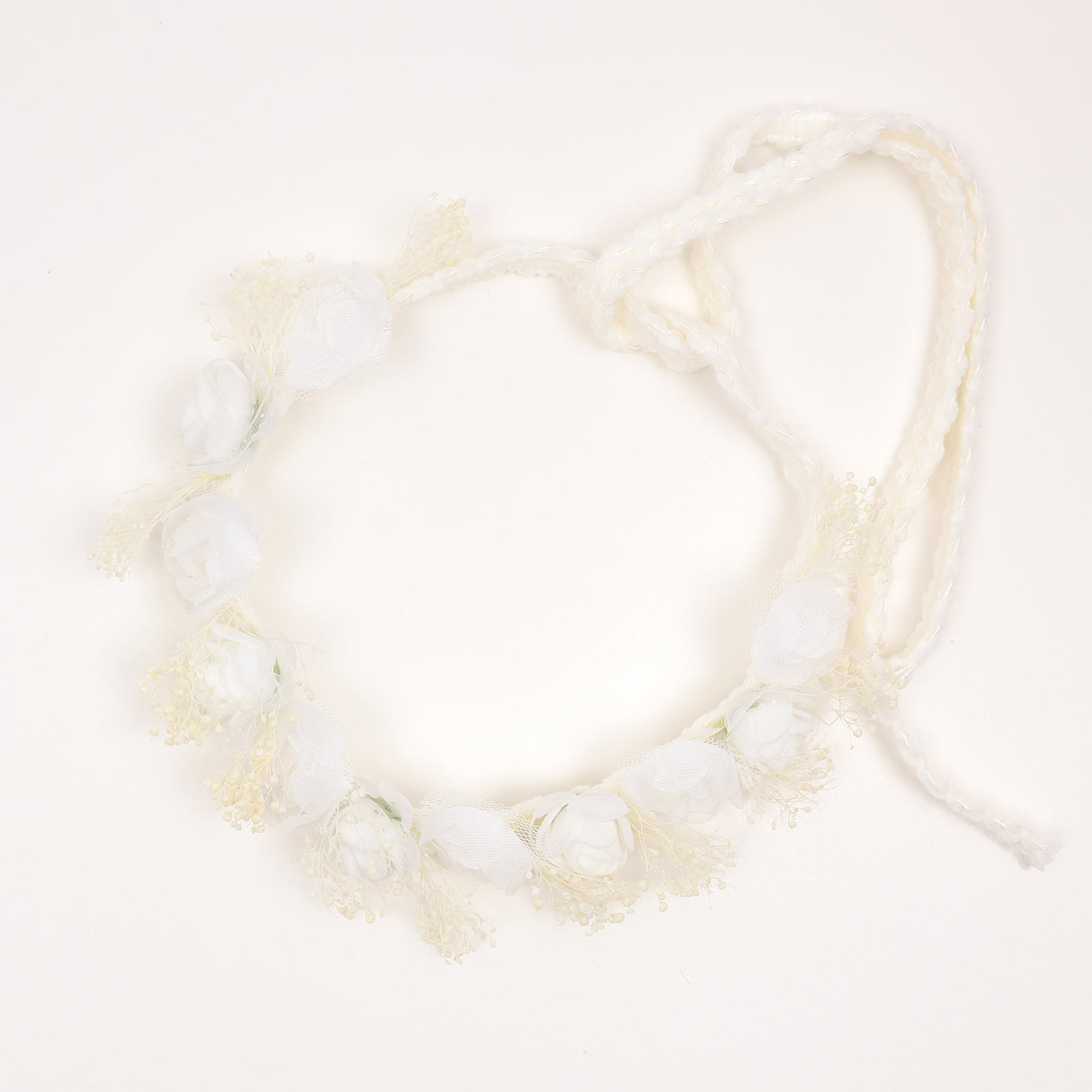 A lightweight circular headband featuring layered fabric flowers, fine mesh accents, and subtle bead embellishments in a soft ivory tone. Designed with a smooth, flexible band.