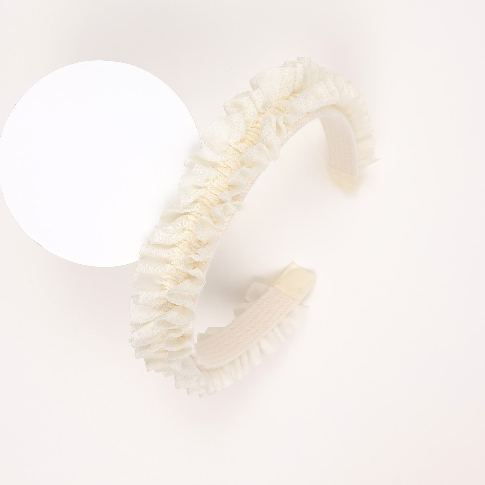 Lightweight hairband with a padded curved base and soft ruffled fabric trim. Finished in an ivory tone with a smooth inner lining.
