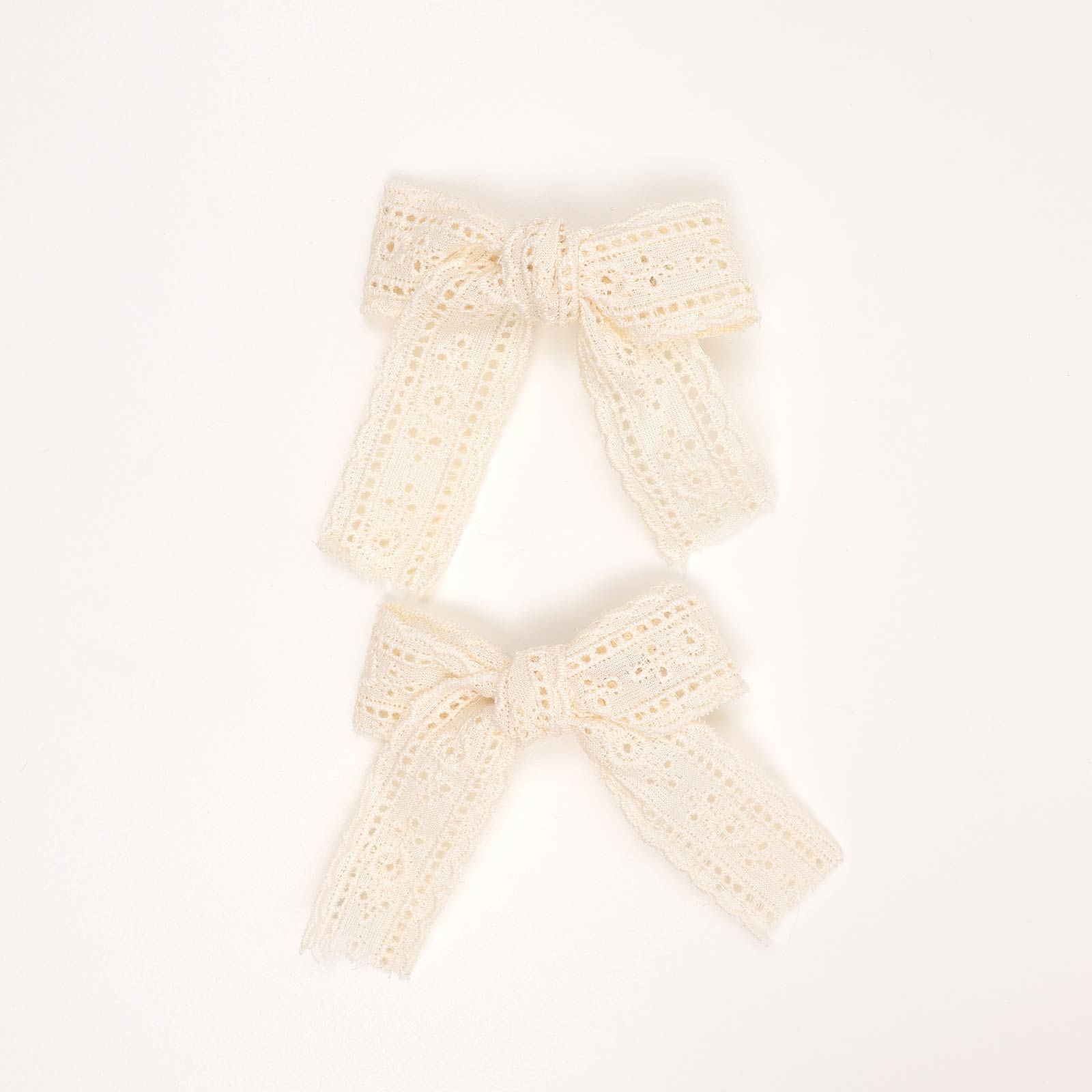 Set of two hair clips featuring a structured ribbon bow design with lace fabric overlay and secure clip backing. Suitable for everyday wear and special occasions.