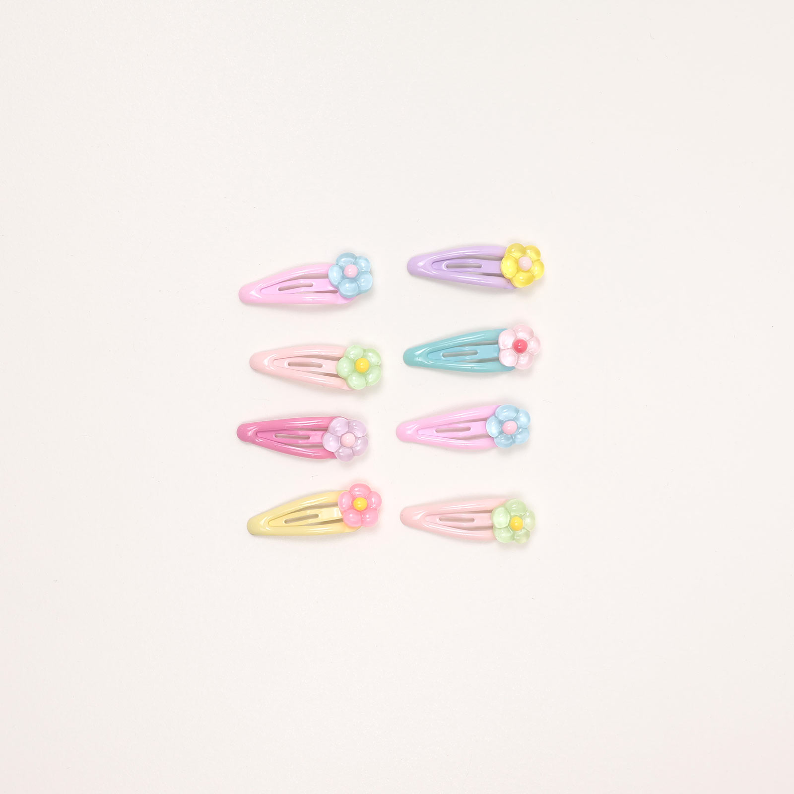 This set contains 8 mini snap-style hair clips featuring a floral design.