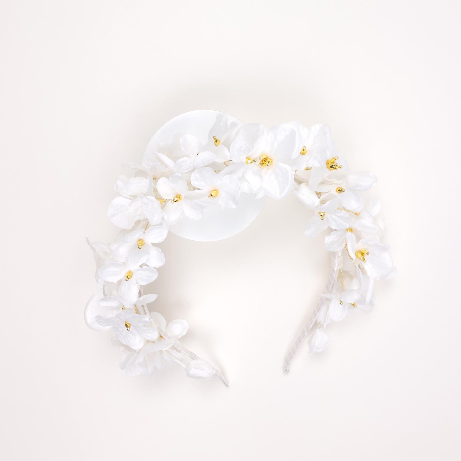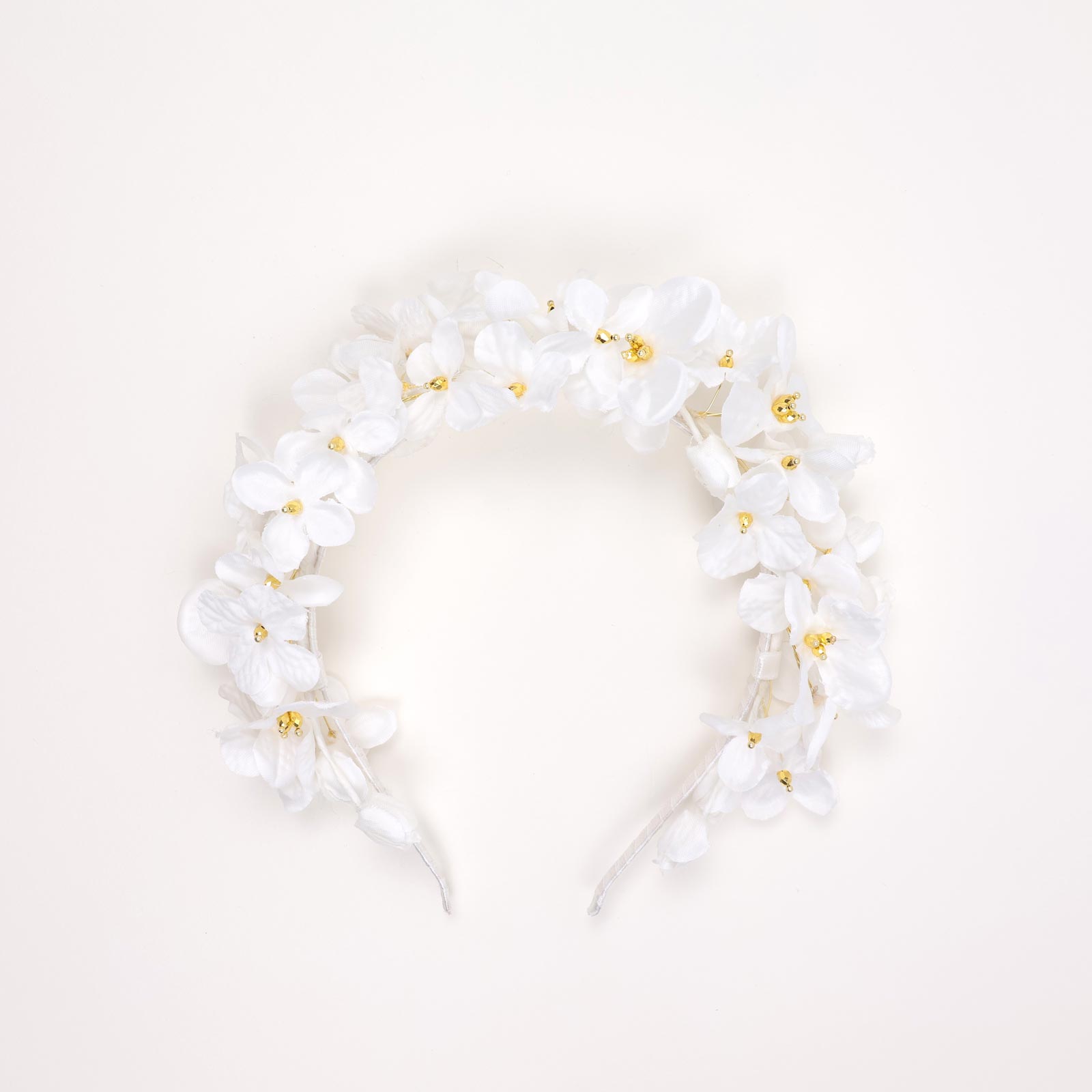 A charming floral headband featuring clusters of white fabric flowers with delicate gold bead centers.