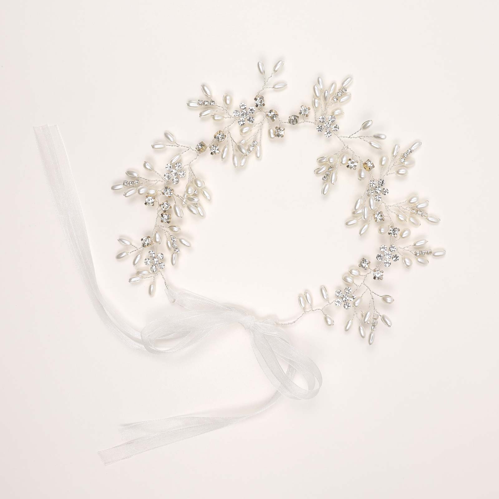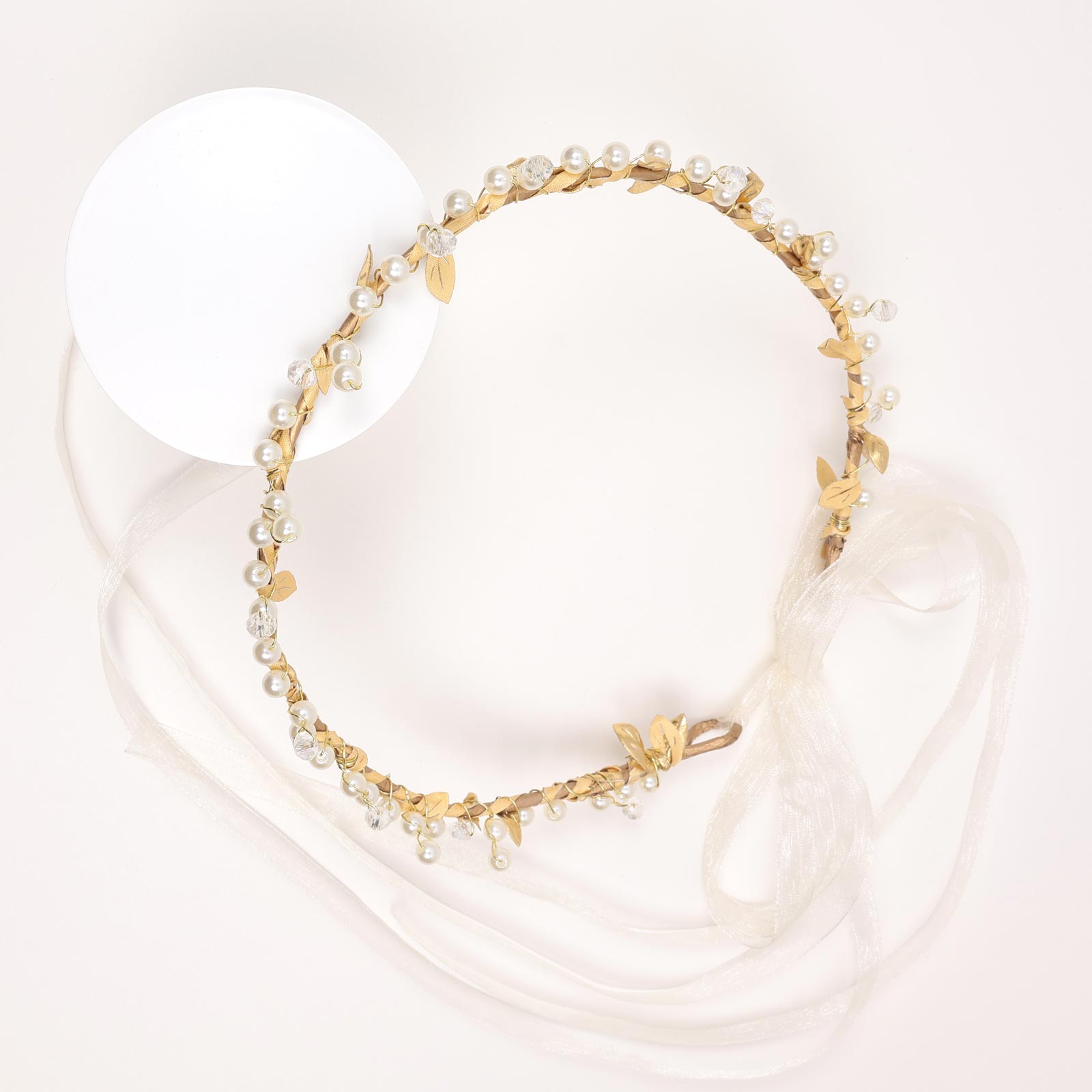 Elegant headband featuring pearl and crystal accents with delicate leaf details. Finished with a soft ribbon tie.