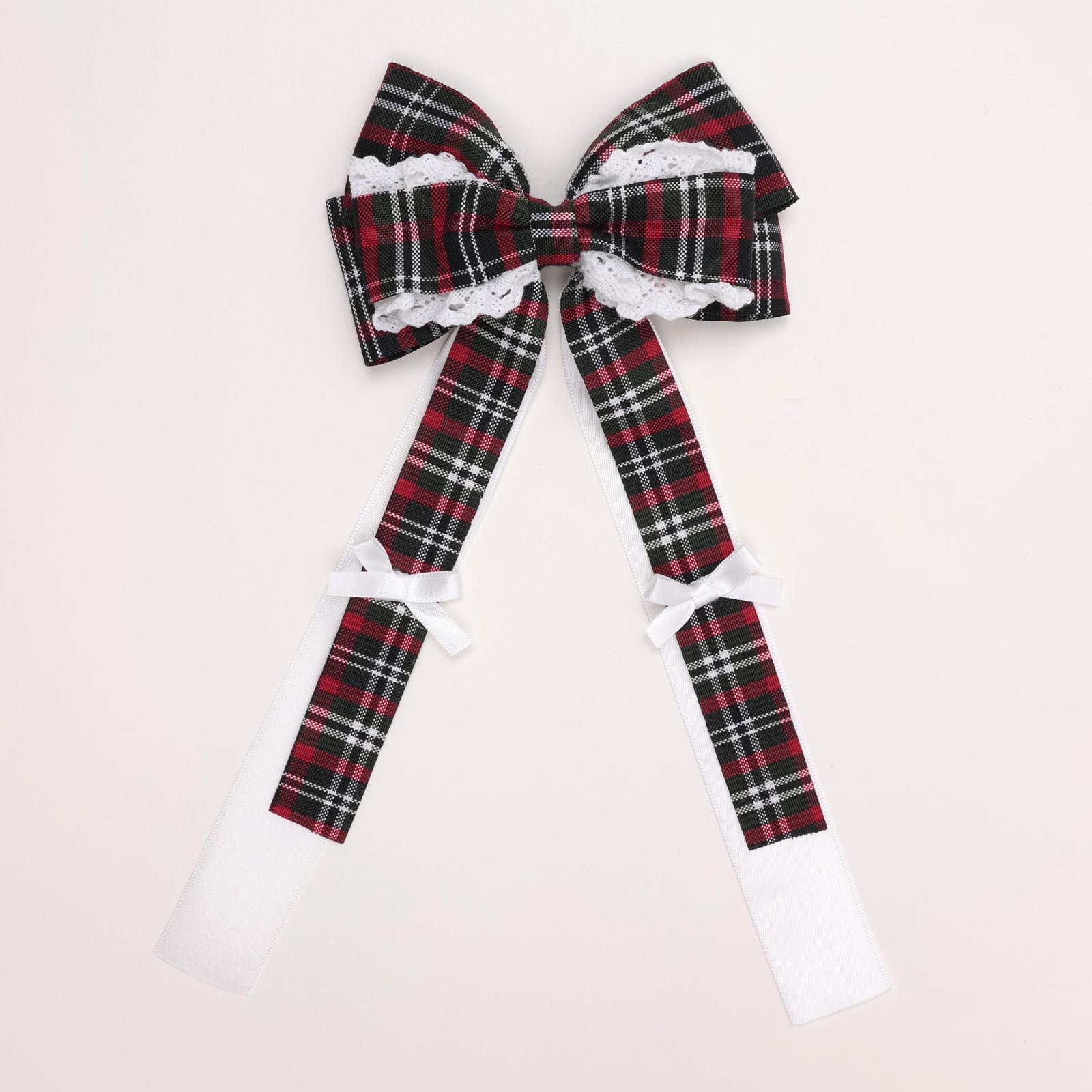 A large plaid-patterned bow hair clip designed for school use. The bow is made from red, black, and white checkered fabric and is adorned with lace accents. The tails of the bow are long, with white ribbons at the ends, adding an elegant and refined touch suitable for school uniforms.