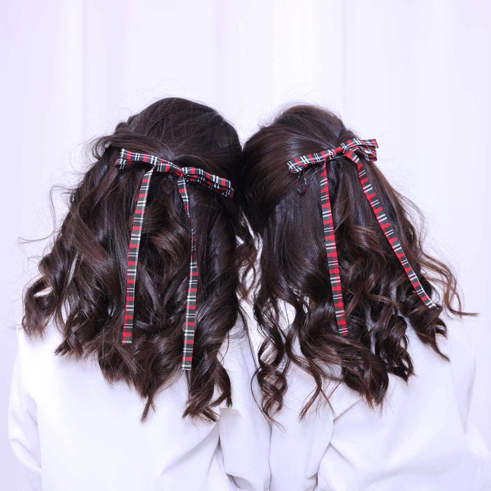 A decorative school hair clip features a red, black, and white plaid bow layered over a delicate white lace base. The lace is textured with small embroidered dots and scalloped edges.