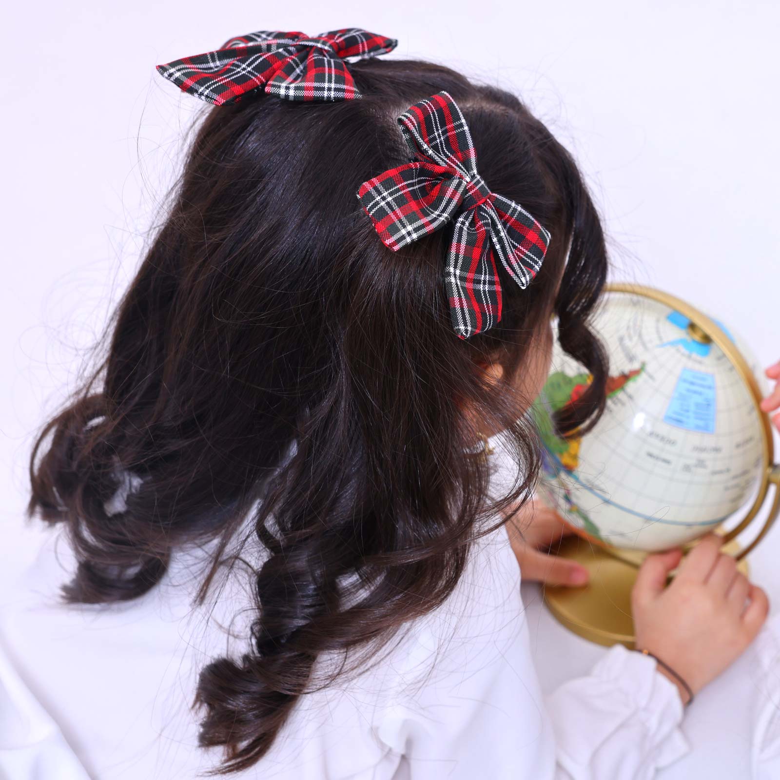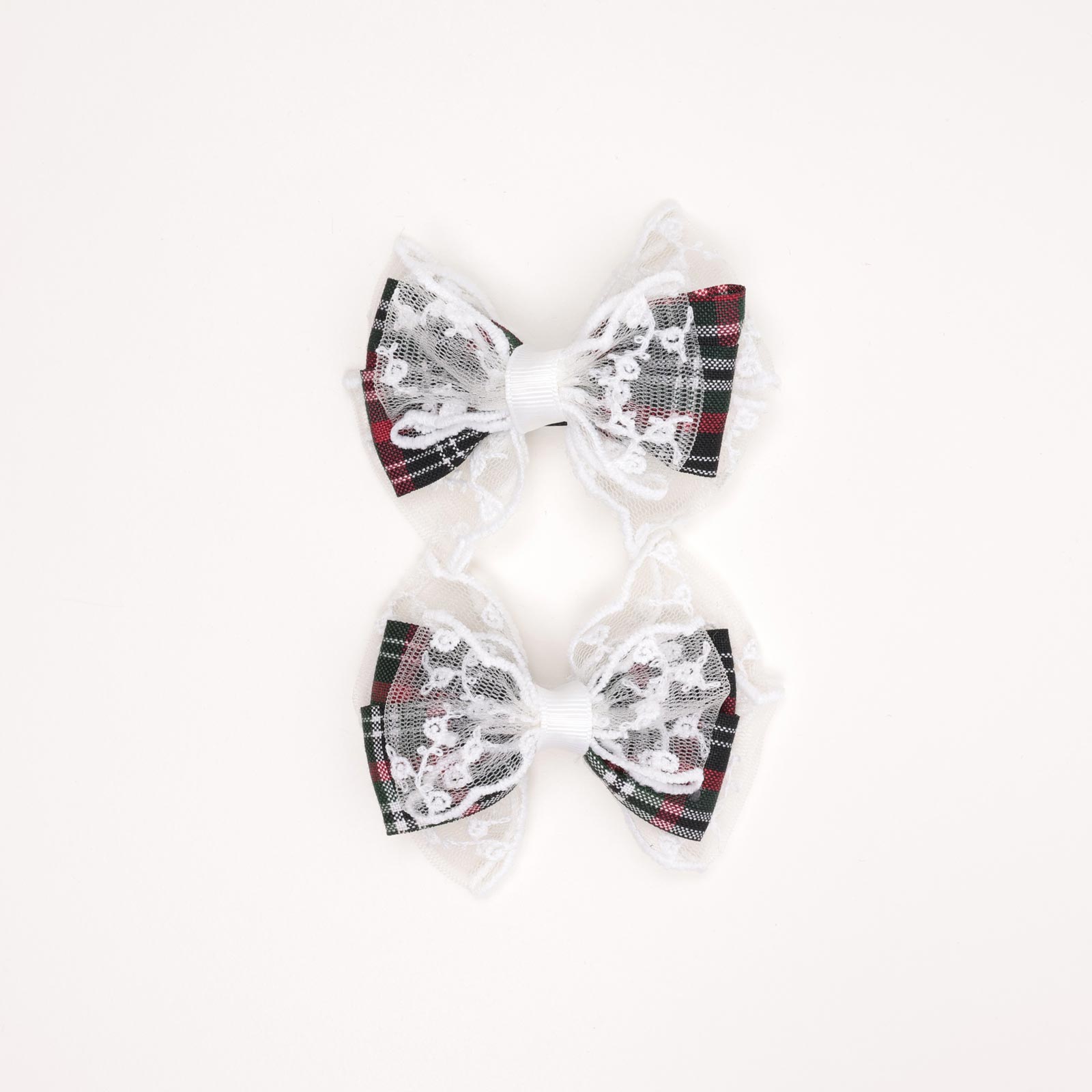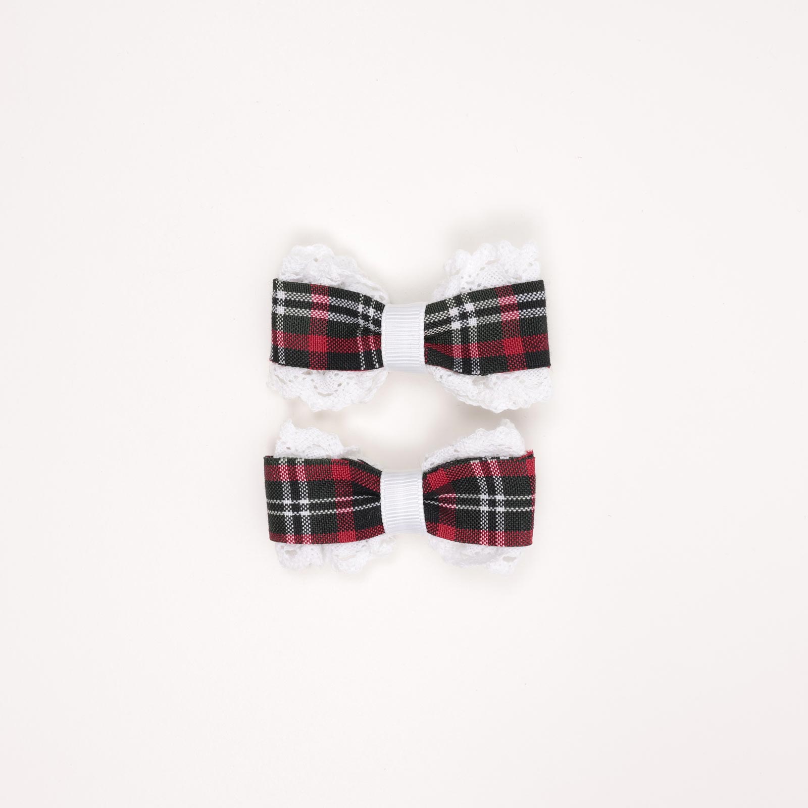 A decorative school hair clip features a red, black, and white plaid bow layered over a delicate white lace base. The lace is textured with small embroidered dots and scalloped edges.