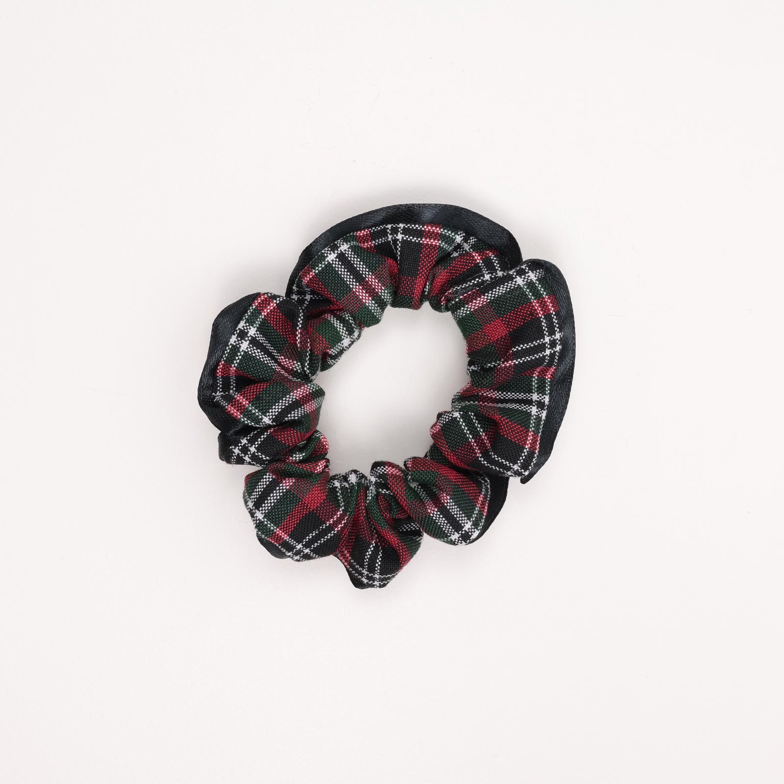 A school hair scrunchie featuring a black, red, and white plaid pattern. The scrunchie has a ruffled design and is bordered with a dark satin trim.