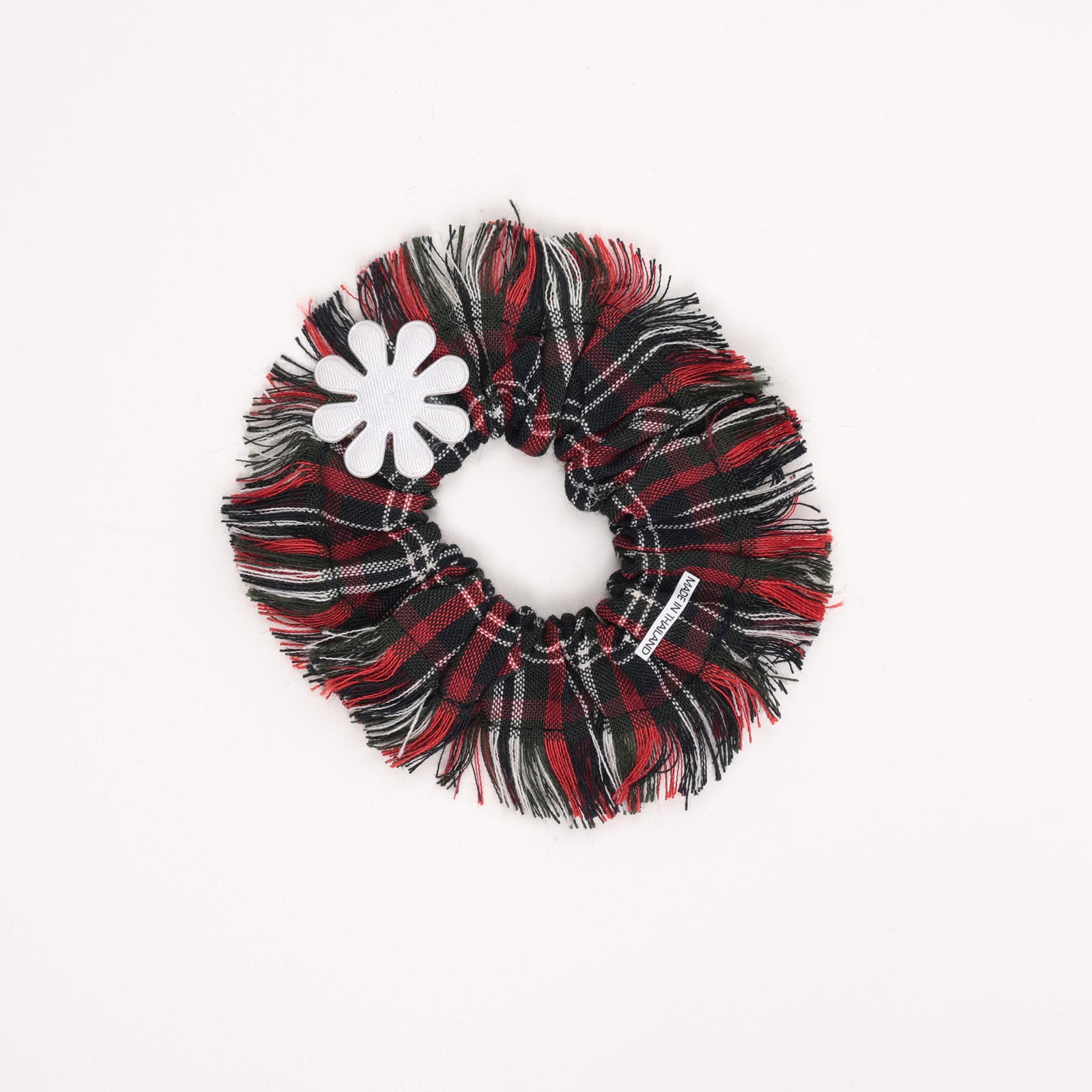 A school hair scrunchie features a red, black, and white plaid pattern with frayed edges for a textured look. It is adorned with a small white flower applique, adding a playful touch. The elastic design ensures a secure fit.