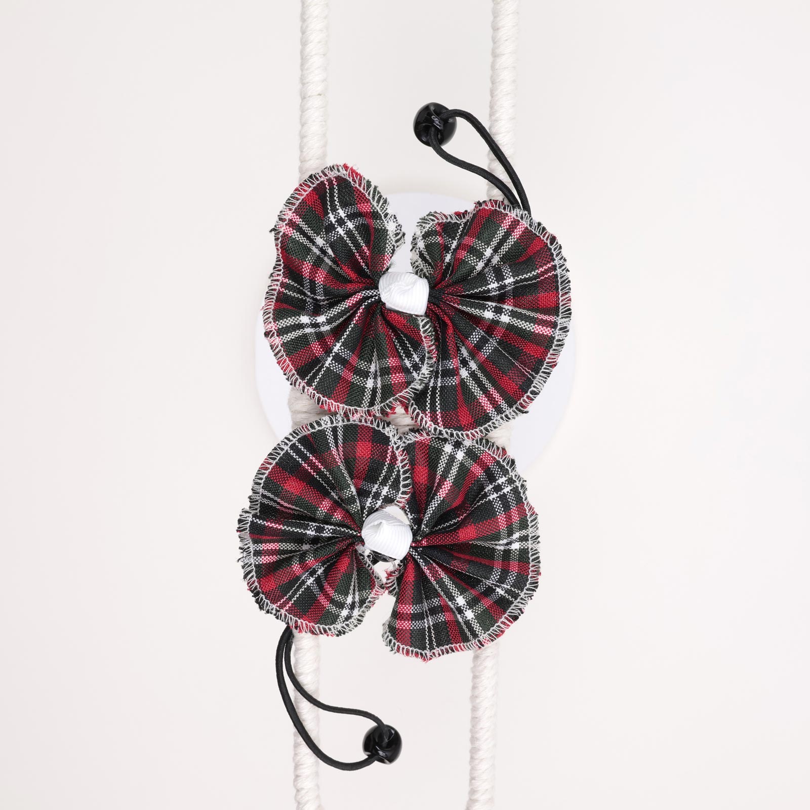 School hair ties featuring large plaid bows in red, black, and white. The bows have a ruffled texture and are secured with a white fabric in the center.