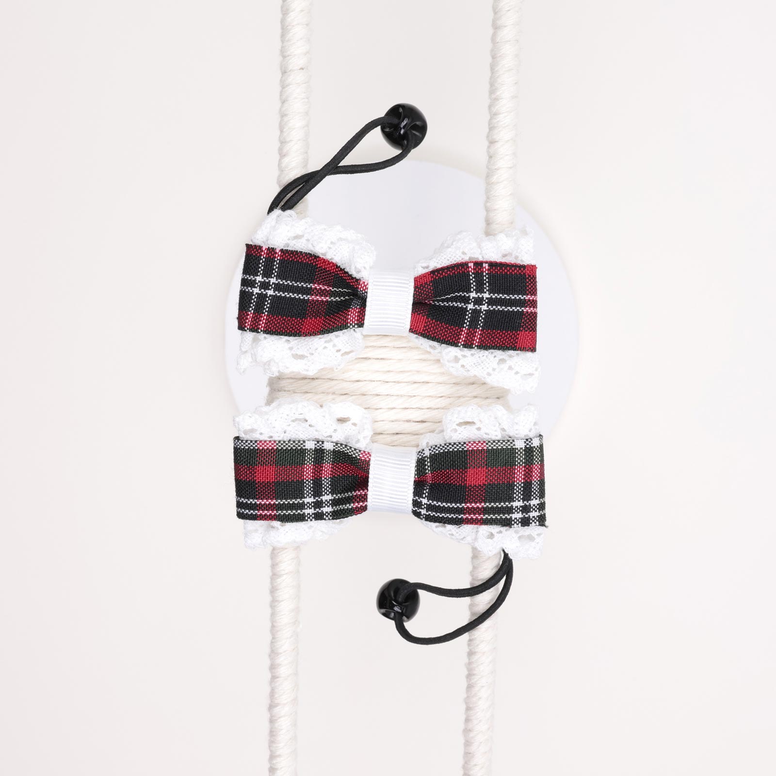 School hair ties featuring plaid bows in red, black, and white, enhanced with a delicate lace trim along the edges. The tie features a black elastics to secure tight.