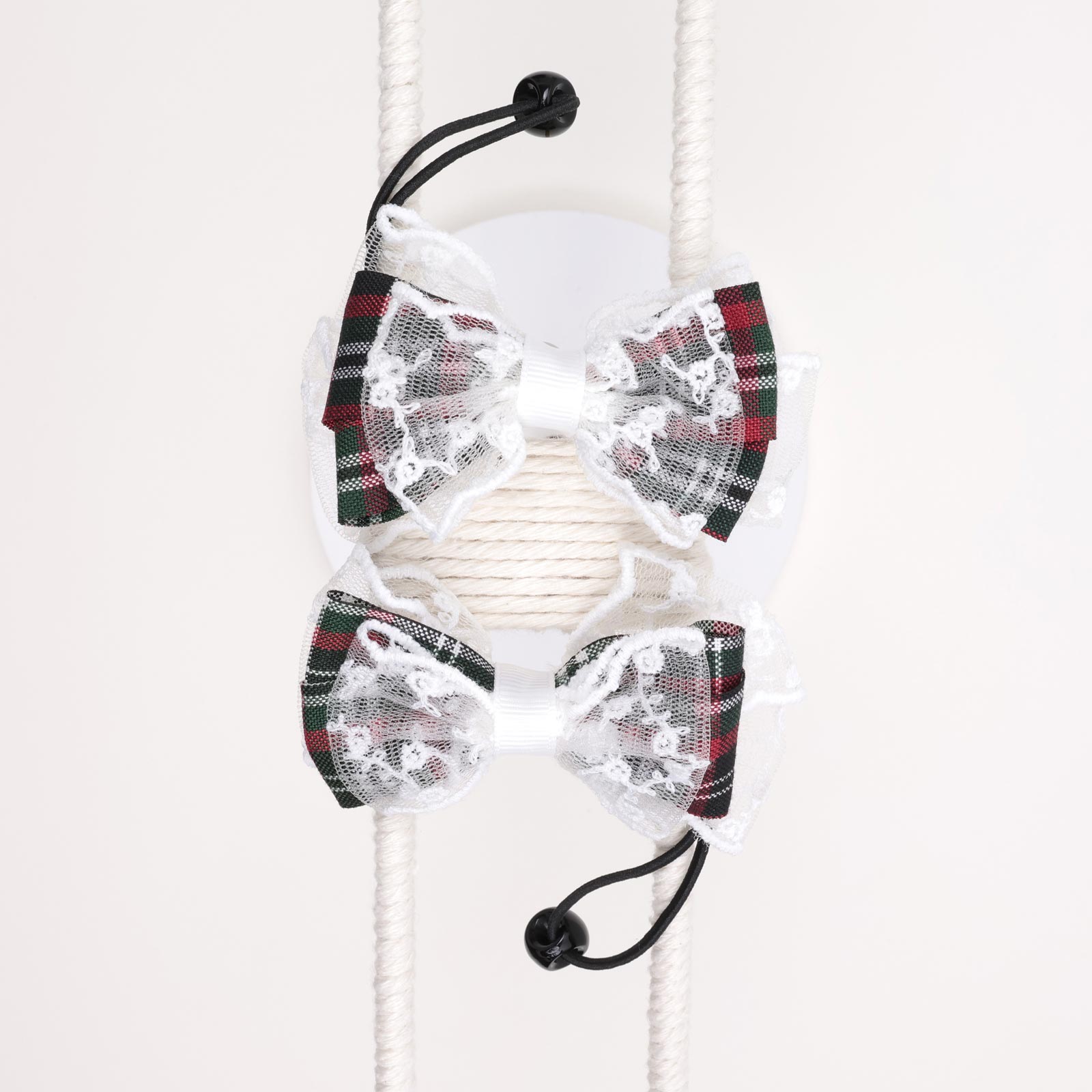 A pair of school-style hair ties, each adorned with plaid ribbons and lace accents. The bows are featured with black elastic bands for secure wear.