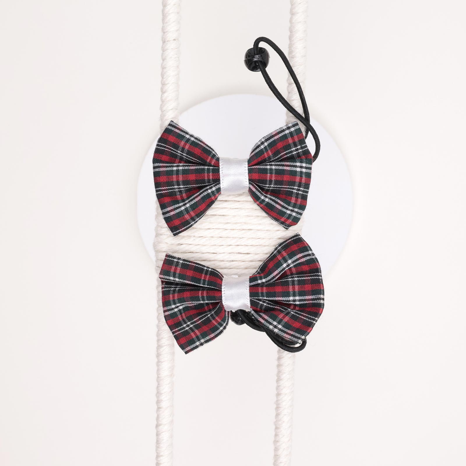 A pair of school-themed hair ties featuring red and black plaid bows. Each bow is accented with a white satin ribbon in the center. The ties are attached to adjustable black elastic bands for easy use and a secure fit.
