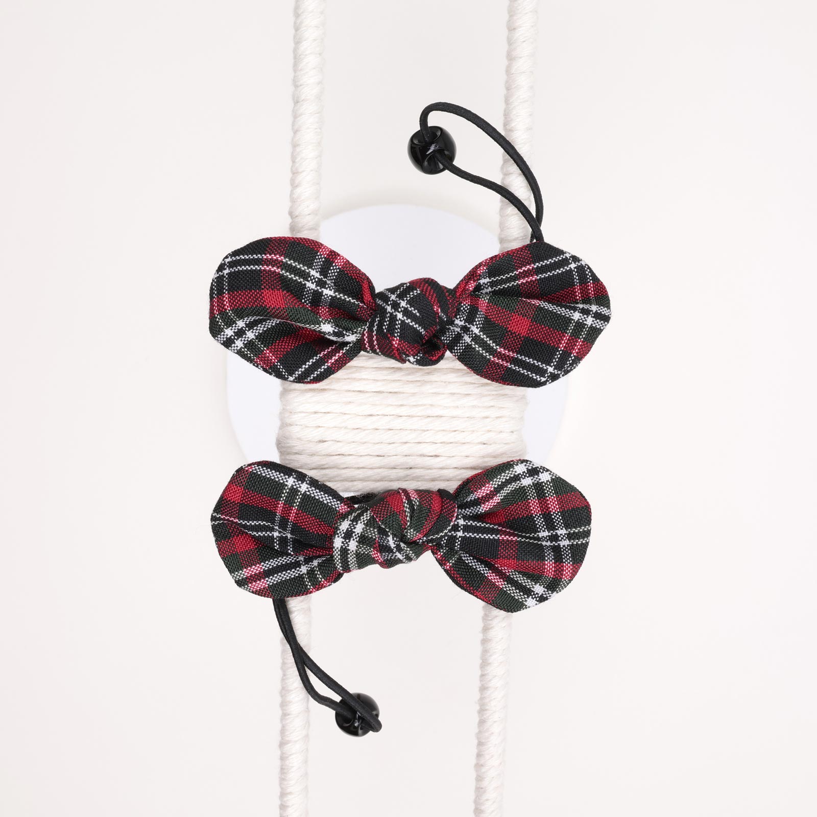 A pair of school-themed hair ties with a red, green, and white plaid pattern. The bows are knotted at the center.