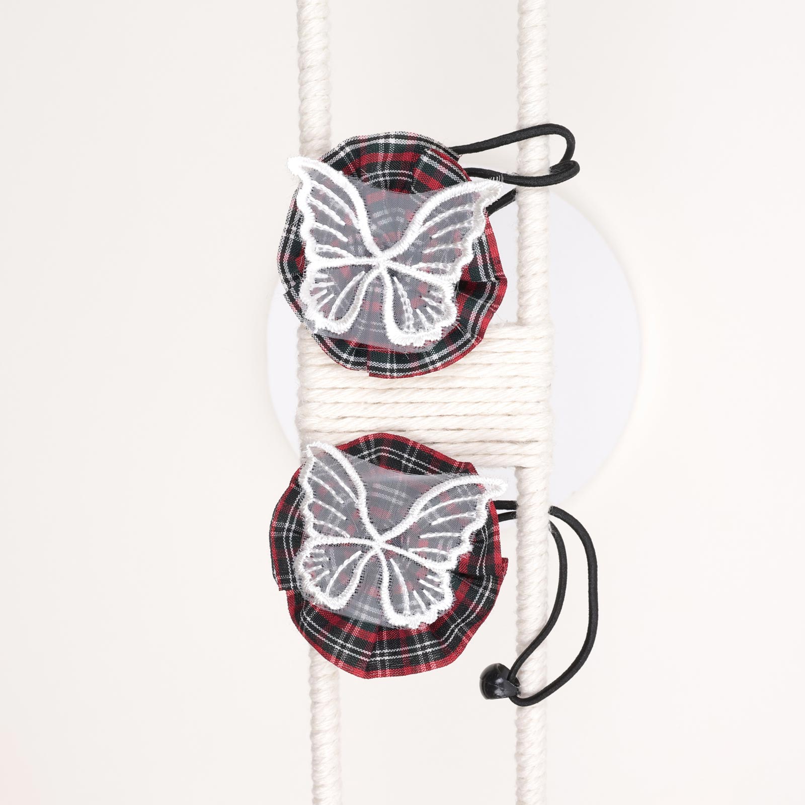A pair of school hair ties, made of plaid fabric with a butterfly embroidery design. The ties are neatly gathered and features black elastic cords for tight secure.
