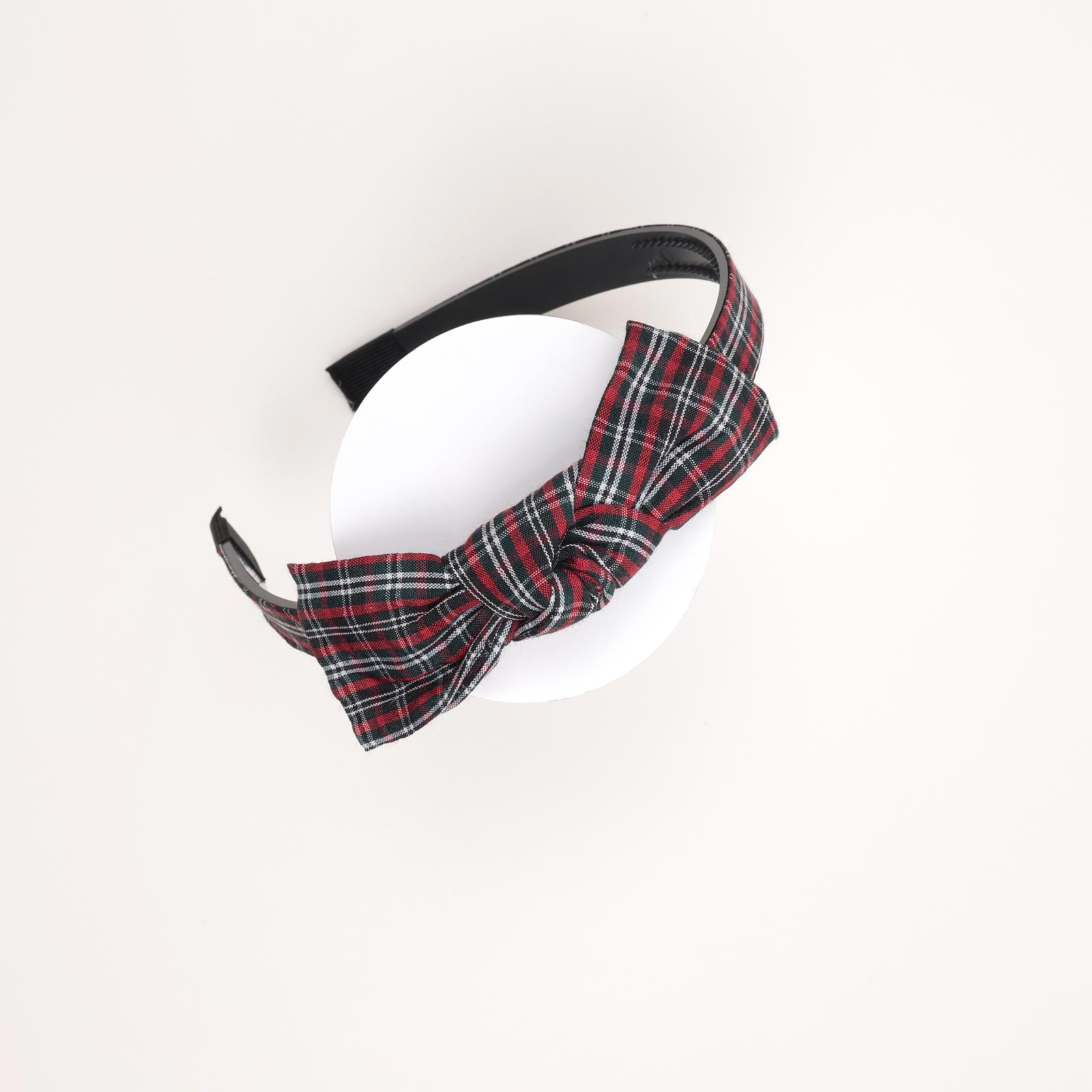 A fabric-covered school headband with a classic red, black, and white plaid pattern. It features a prominent bow knot on top and a slim black base.