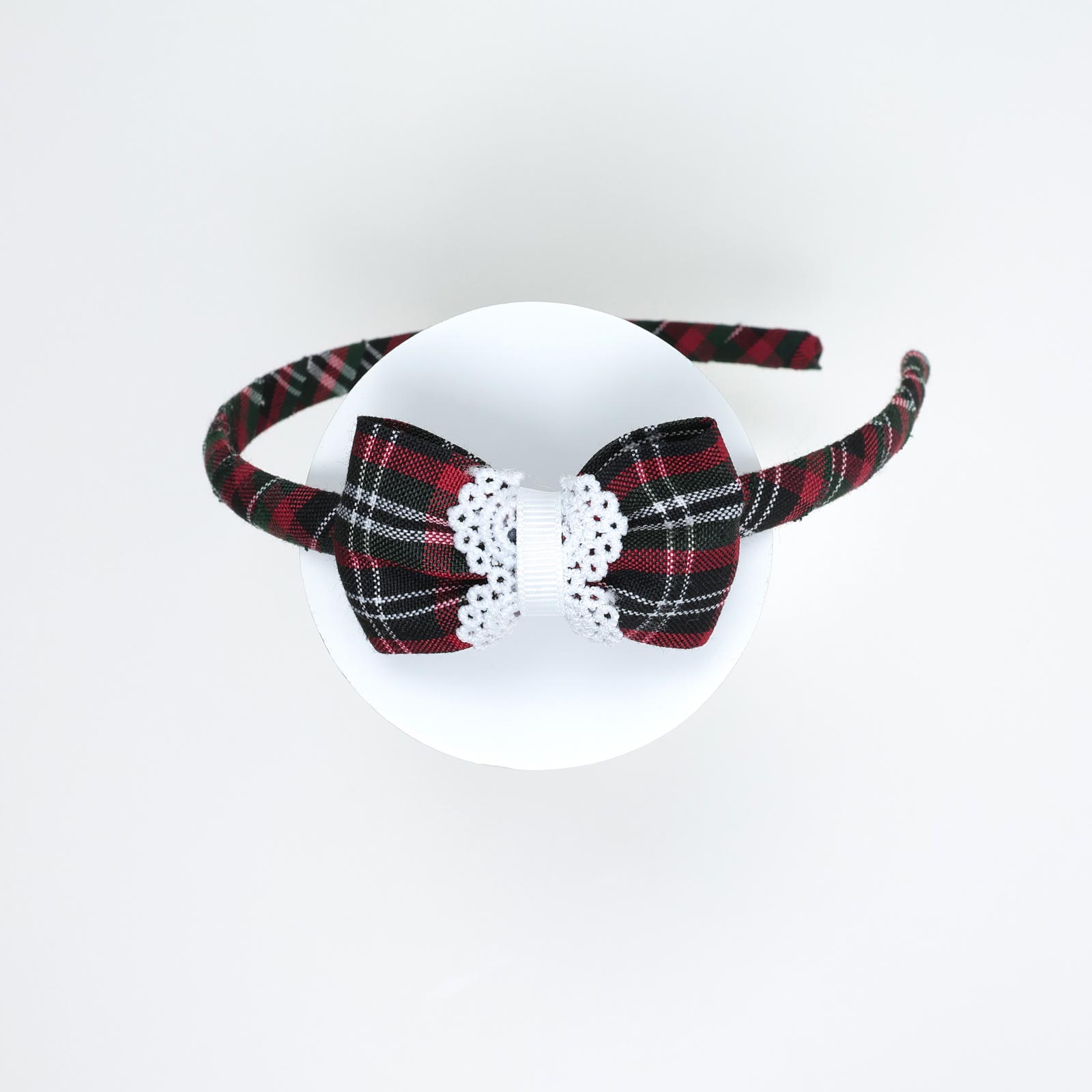 A school headband features a classic red, black, and green plaid fyonka accented with white lace at the center, tied with a white fabric band. The outer band is wrapped in matching plaid fabric.
