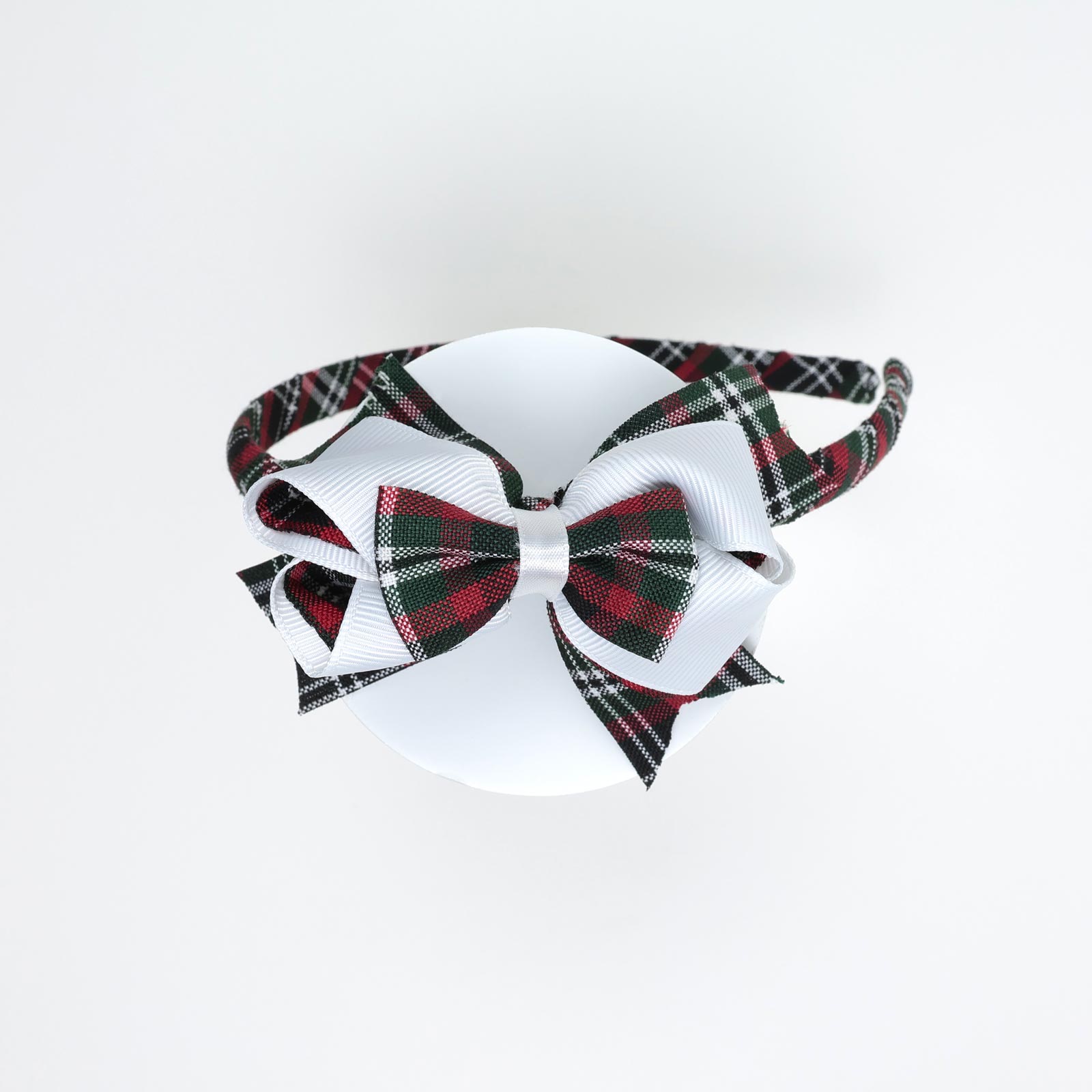 A school headband features a striking double-layered bow crafted from a combination of white grosgrain ribbon and red-green-black plaid fabric. The bow is full and symmetrically arranged, while the headband itself is wrapped in the same plaid material.
