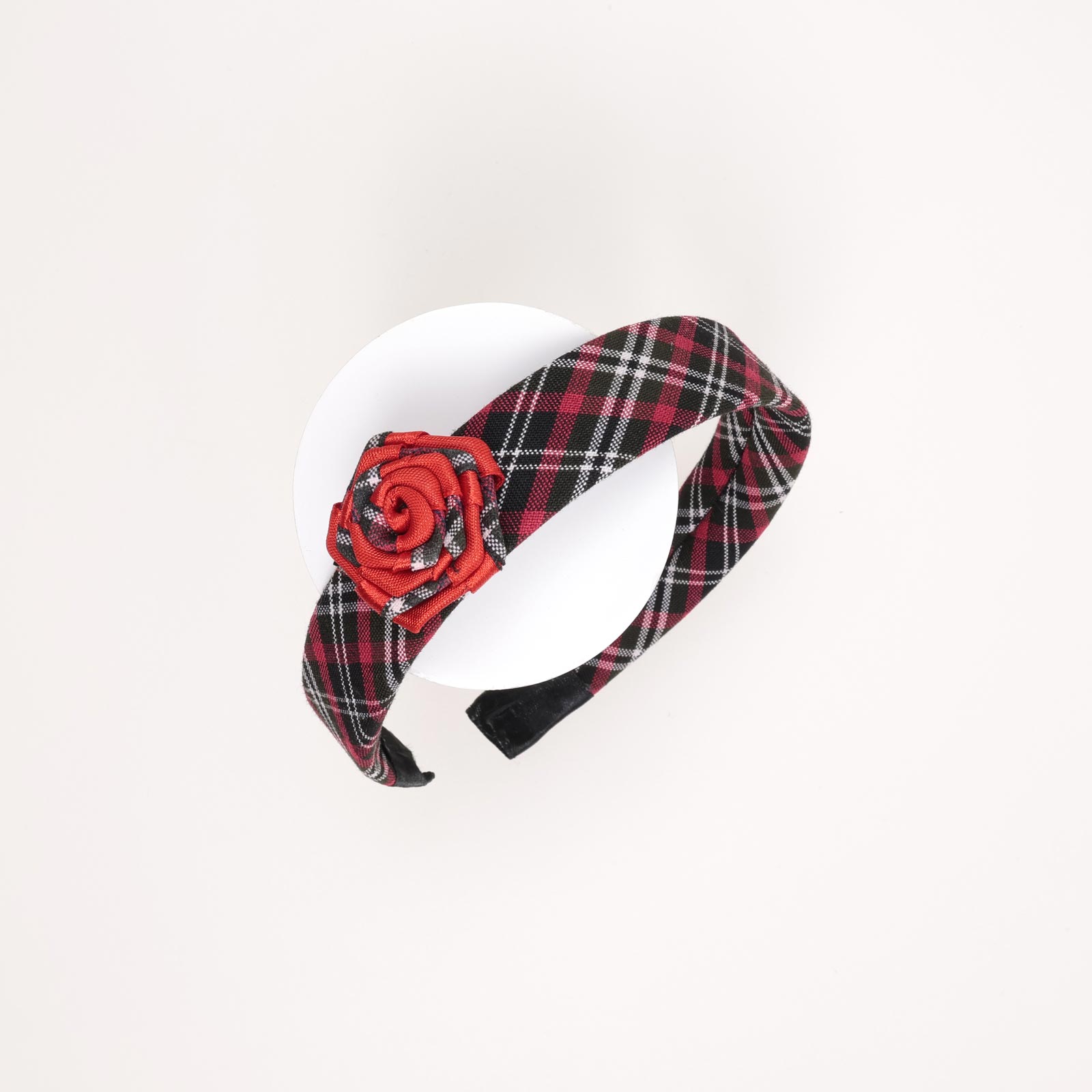 A school headband features a red and black plaid fabric with fine white accents. It is adorned with a striking red rosette made from fabric ribbon.