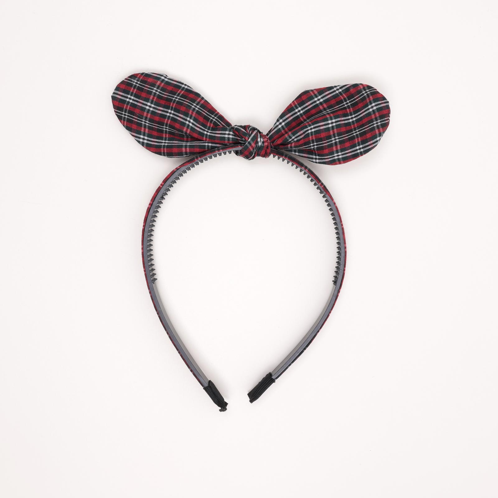 A slim plastic school headband wrapped in a red, black, and white plaid fabric. It features a playful knotted bow on top with two pointed, ear-like extensions.