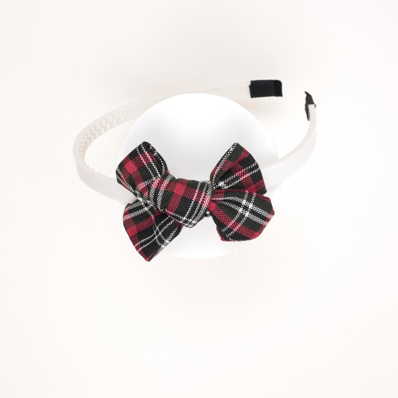 A white plastic school headband adorned with a medium-sized plaid bow in red, black, and white with a featured fyonka in the middle.