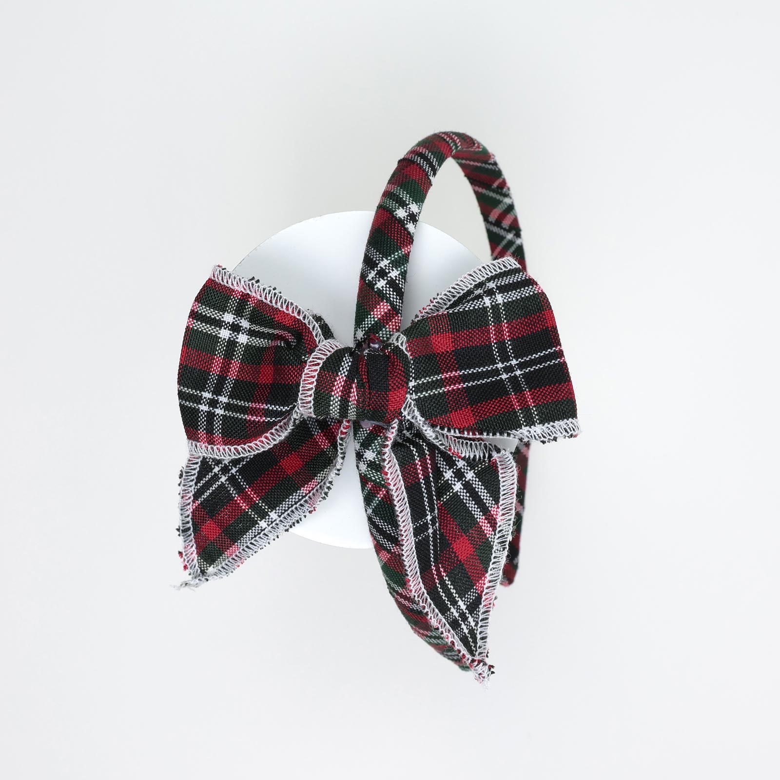 A school headband wrapped in red, black, and white plaid fabric, adorned with a large matching bow. The bow features frayed edges and a layered design.