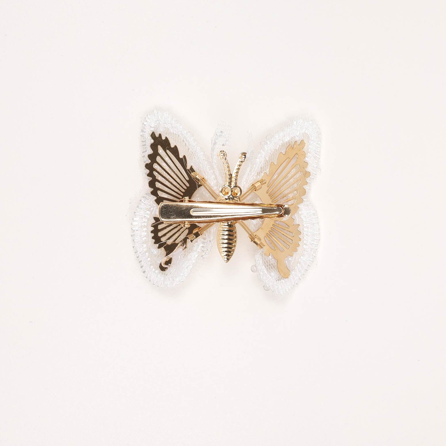 Elegant butterfly hair clip with white beads accents on a gold-tone metal clip.