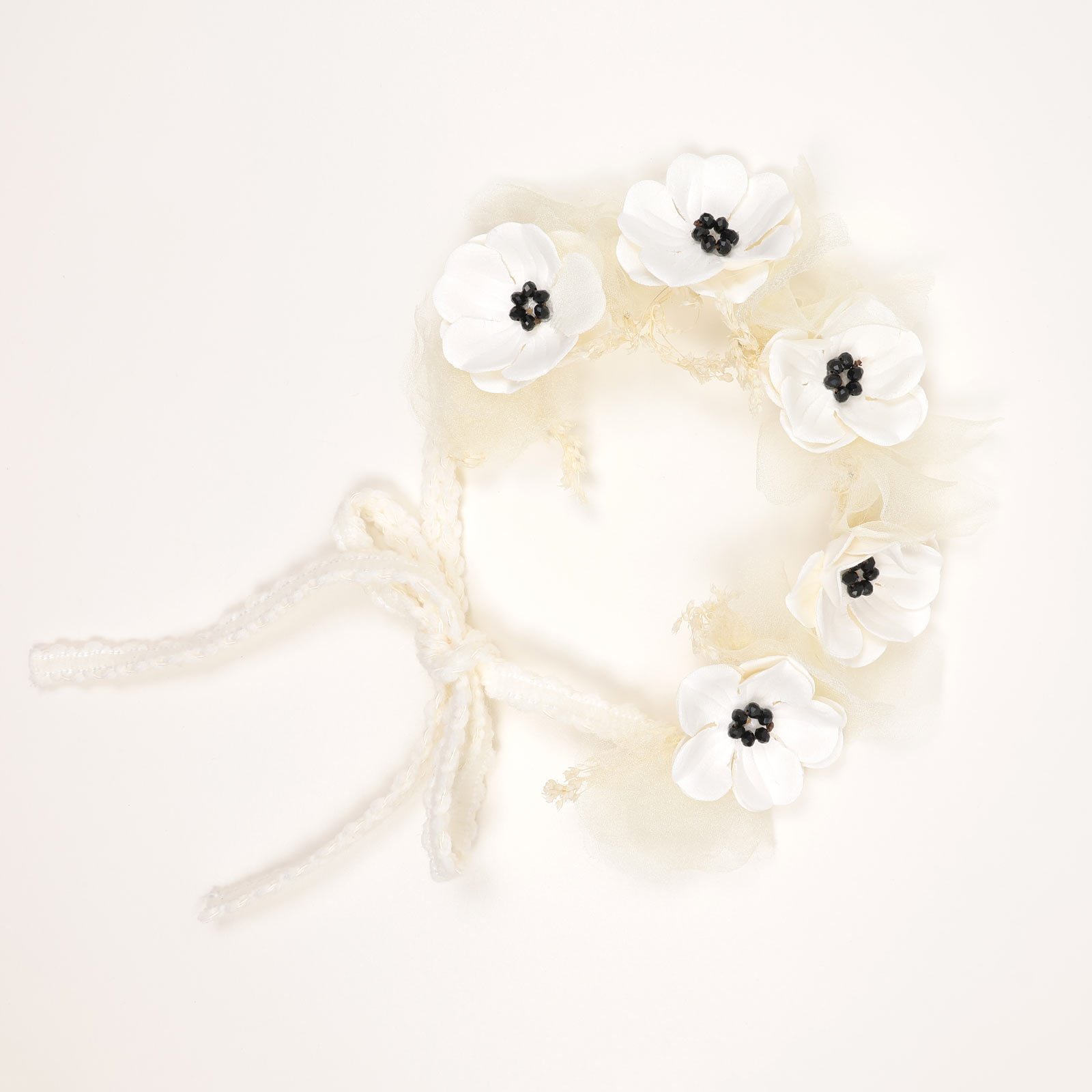 Flower crown designed with white artificial blossoms arranged on a flexible circular base.